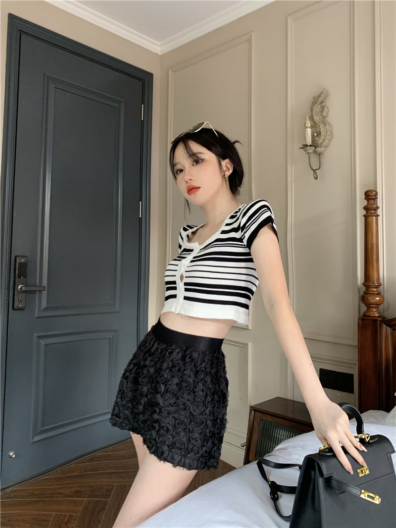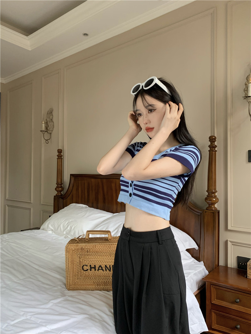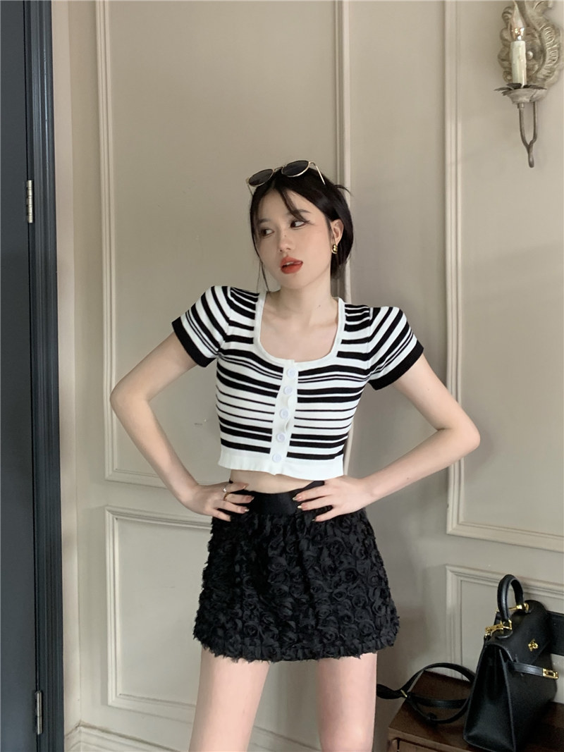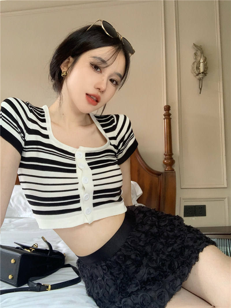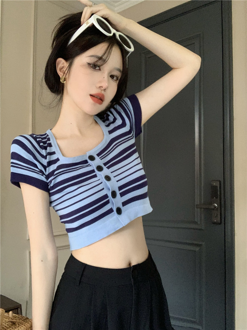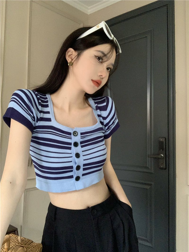 时髦撞色条纹修身针织开衫2022夏季韩系甜美性感方领显瘦上衣女潮