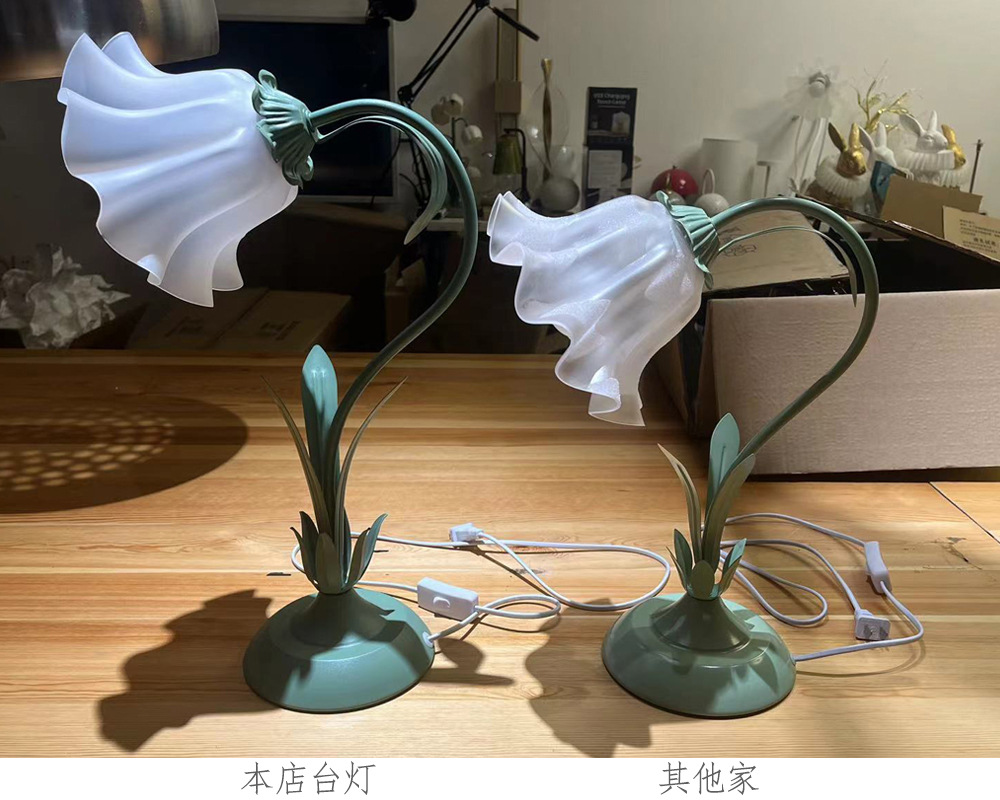 底盘比我们用得更薄,灯体比我们的小三分之一有多,灯罩比我们的更小,叶子和花托用的是更差的