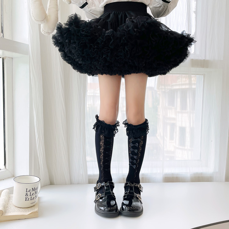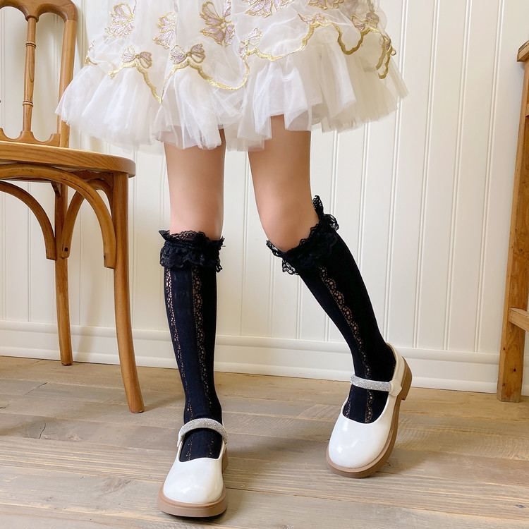 • 레이스 물결 모양의 가장자리 그물 종아리 블랙