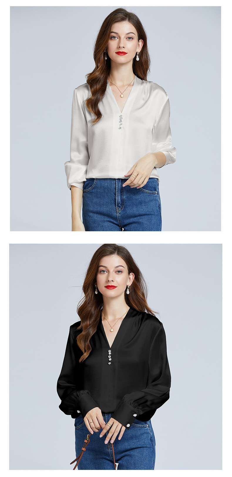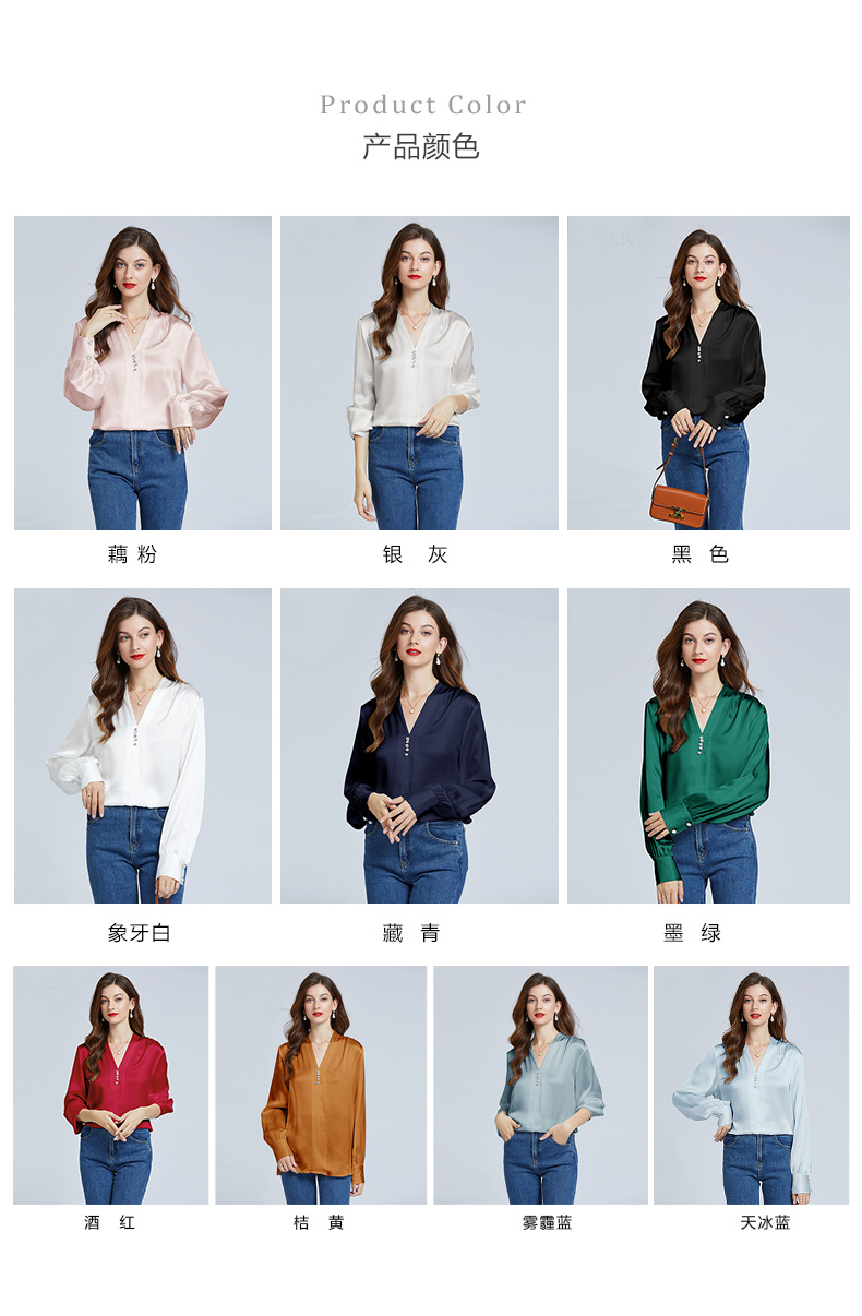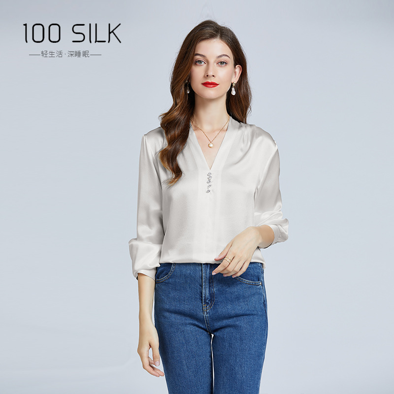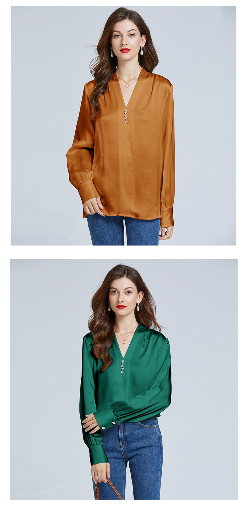 우아한 V-넥 셔츠 풀오버 여성용 실크 긴팔 여성용 셔츠 루즈한 코트 뽕나무 실크 캐주얼 루즈한 탑스토어 가기