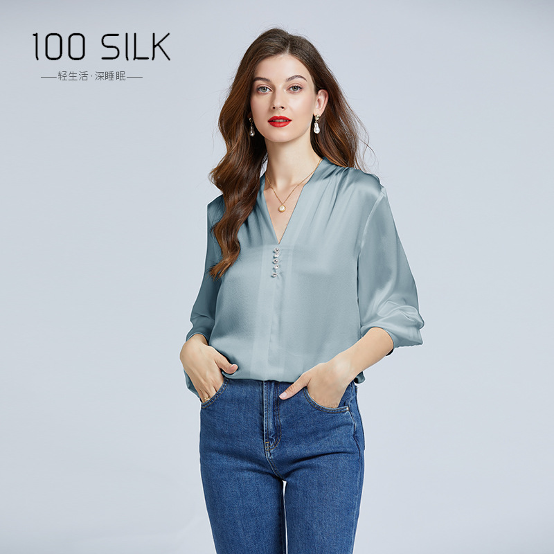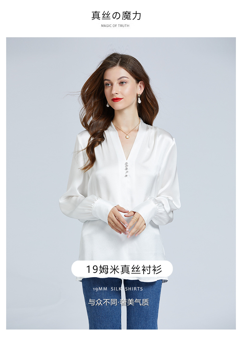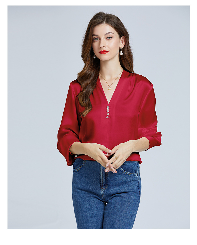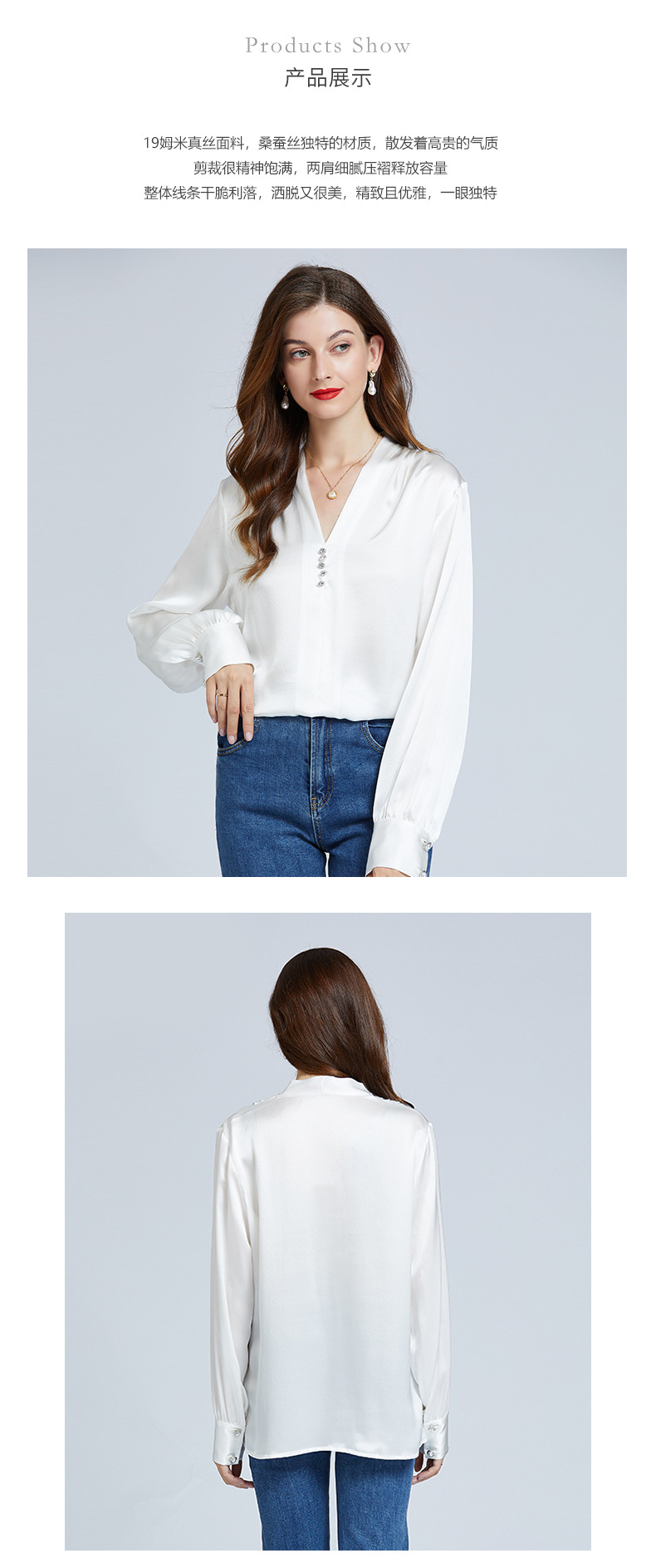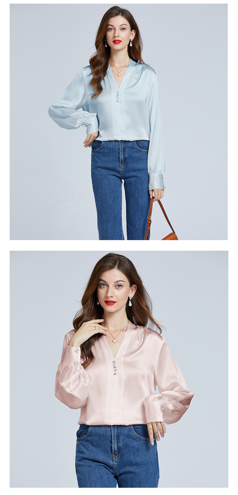 우아한 V-넥 셔츠 풀오버 여성용 실크 긴팔 여성용 셔츠 루즈한 코트 뽕나무 실크 캐주얼 루즈한 탑스토어 가기