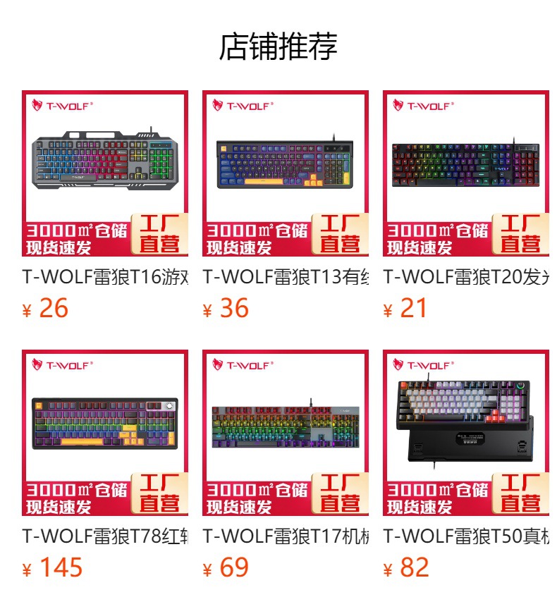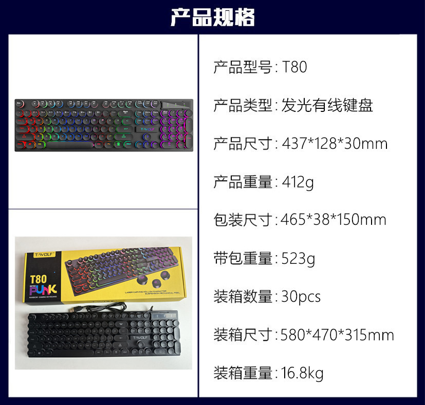 T-WOLF 썬더 울프 T80 단일 키보드 발광 백라이트 색상 다채로운 유선 게임 키보드 문자 빛나는 크로스 보더스토어 가기
