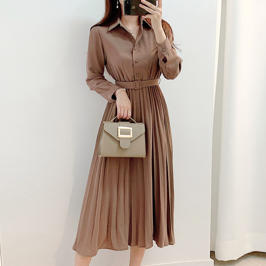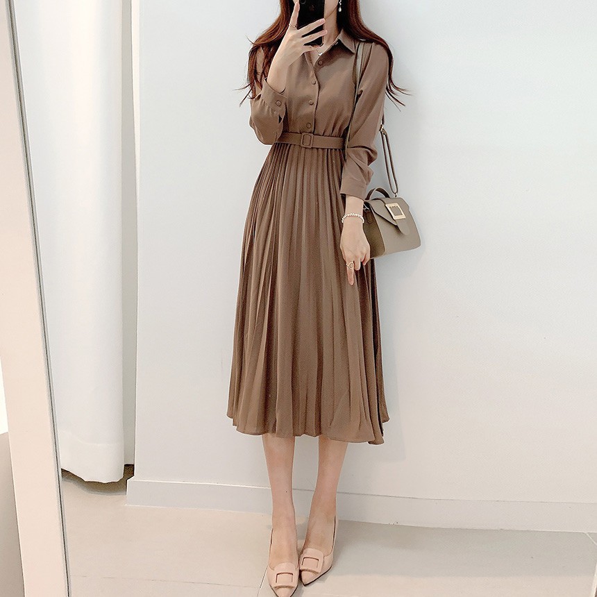 한국 세련된 봄 새로운 우아한 싱글 브레스트 라펠 셔츠 원피스 허리 슬림 중간 길이 주름 치마스토어 가기