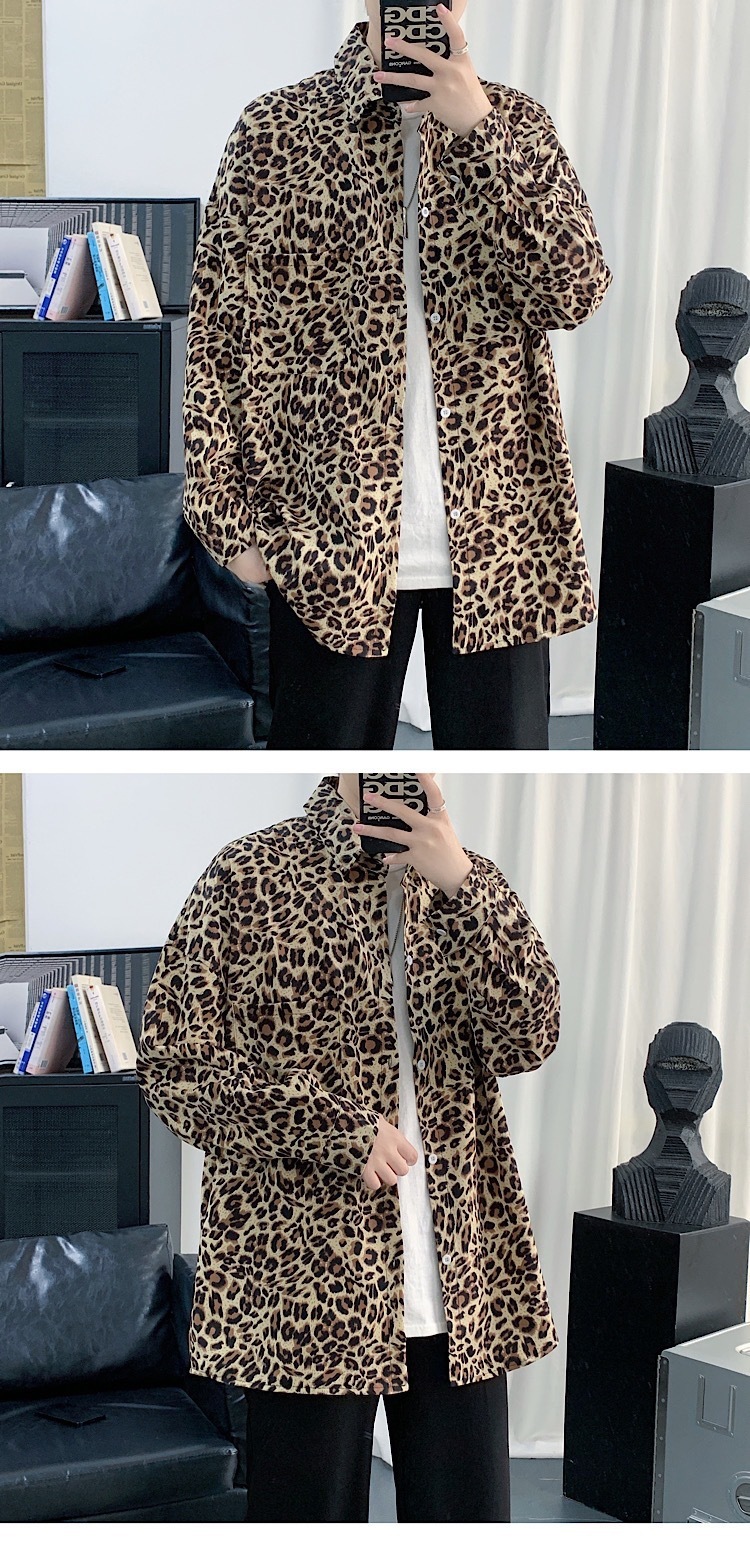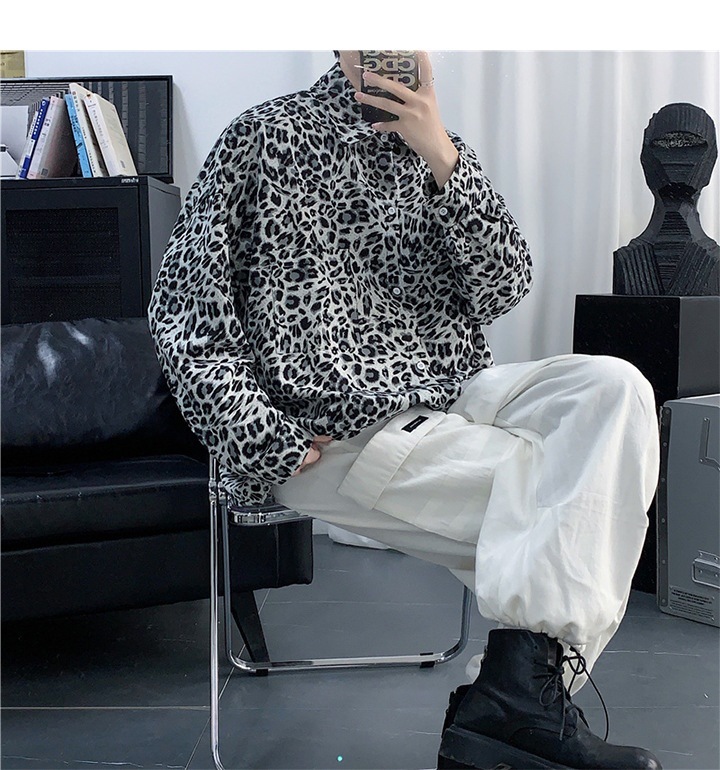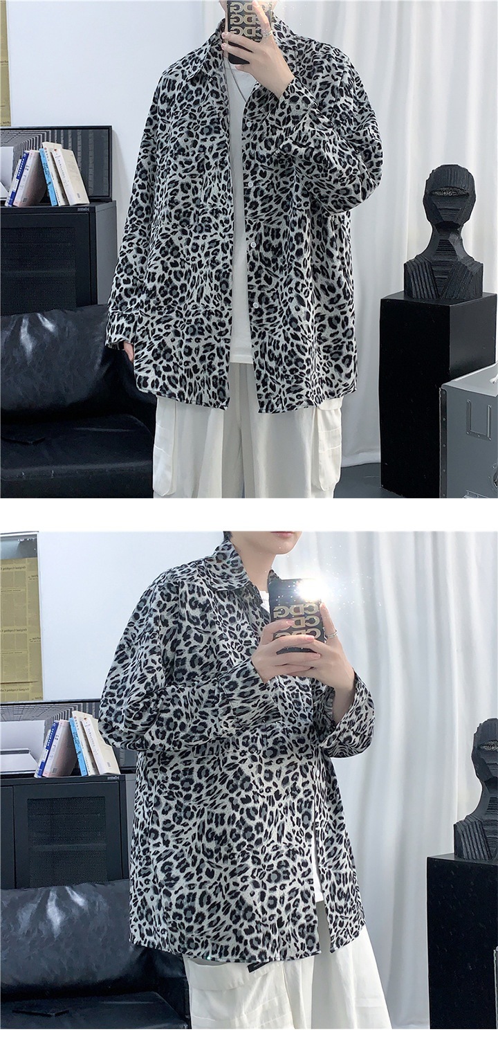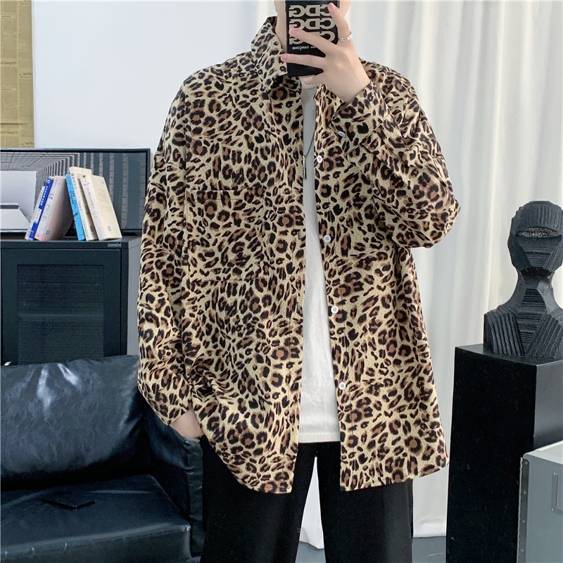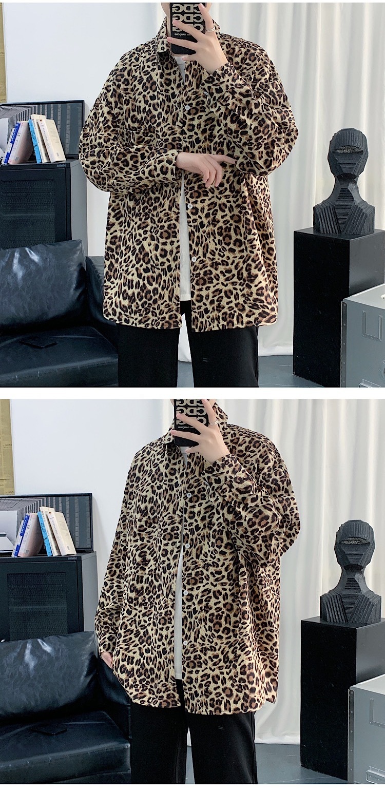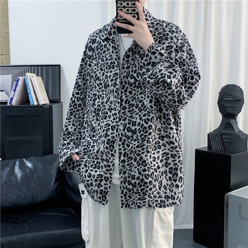 2021 봄과 가을 인스타그램 인기 브랜드 홍콩 스타일 레오파드 무늬 긴 소매 셔츠 남성 한국 스타일 유행 루즈베이스 셔츠 커플스토어 가기