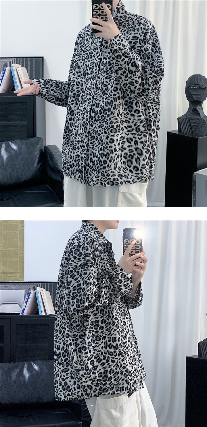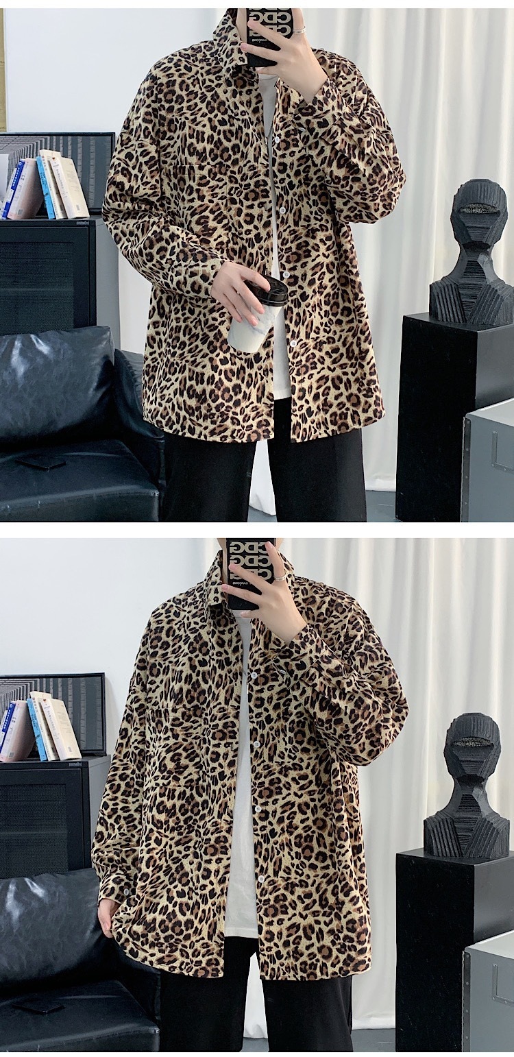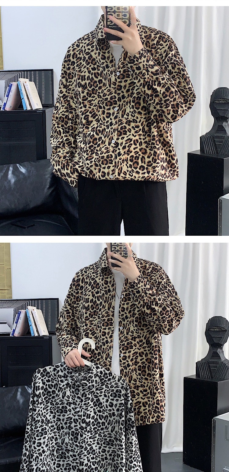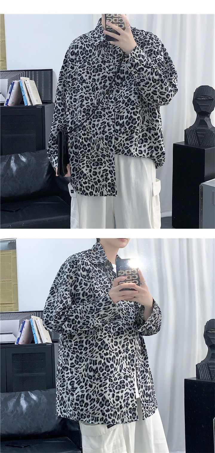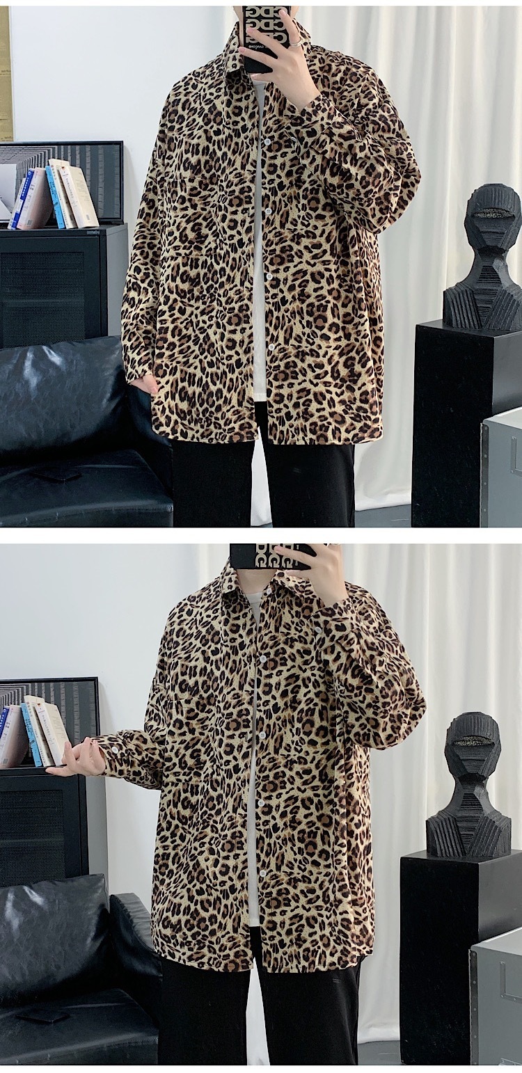 2021 봄과 가을 인스타그램 인기 브랜드 홍콩 스타일 레오파드 무늬 긴 소매 셔츠 남성 한국 스타일 유행 루즈베이스 셔츠 커플스토어 가기