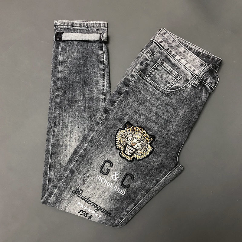 유럽 스타일 큐빅 프린트 데님 팬츠 남성 트렌디 브랜드 신축성 슬림핏 스키니 팬츠 인기 자수 바지 남성용 긴바지