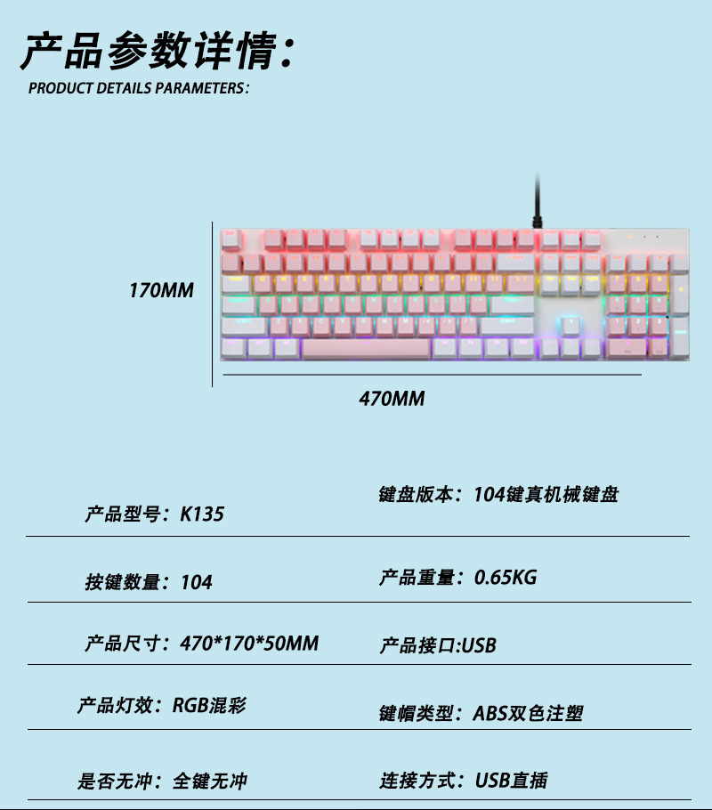 크로스보더 스팟 K135 메탈 패널 기계식 키보드 104키 혼합 색상 발광 e스포츠 게임용 키보드 소량스토어 가기