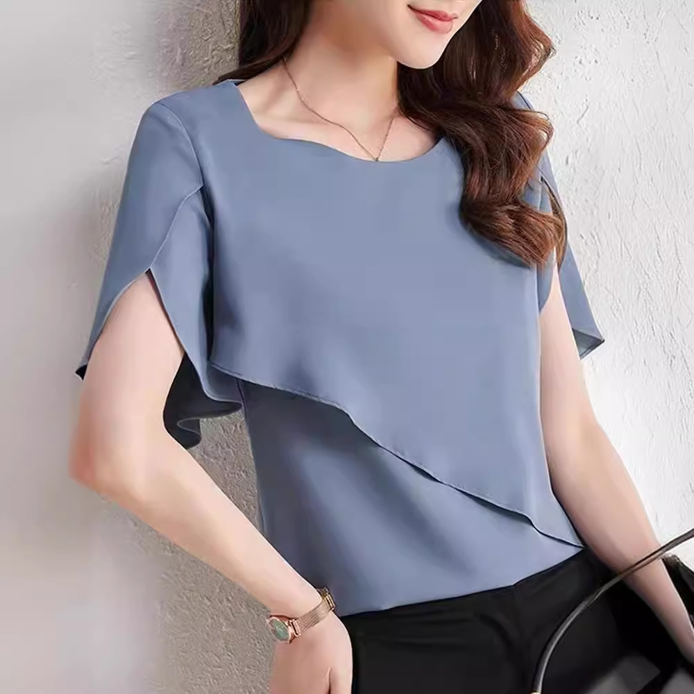 2023 여름 새로운 느슨한 플러스 사이즈 디자인 감각 틈새 짧은 소매 벨 슬리브 배꼽 커버 쉬폰 블라우스 여성 탑