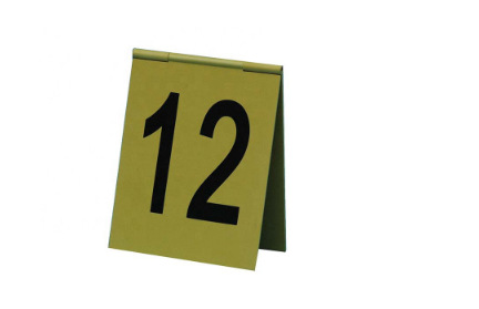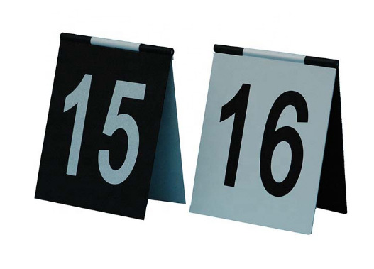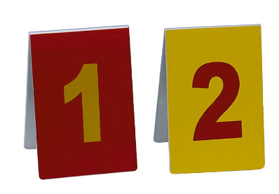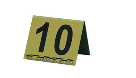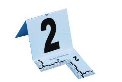 物证牌的形态是用一根线轴连接两个长方形塑料板材,形成合页结构,分开两片可稳定竖立,闭合两片可方便存放。两片板材分别印刷1-50号码,黄底黑字。