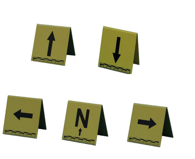 物证牌的形态是“人”形支架,支架的两个侧面分别印刷A-Z共26个英文字母和直形比例尺,黄底黑字。