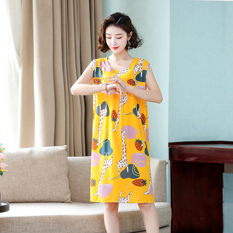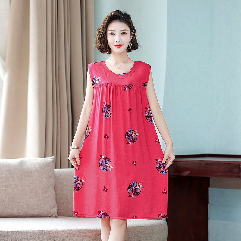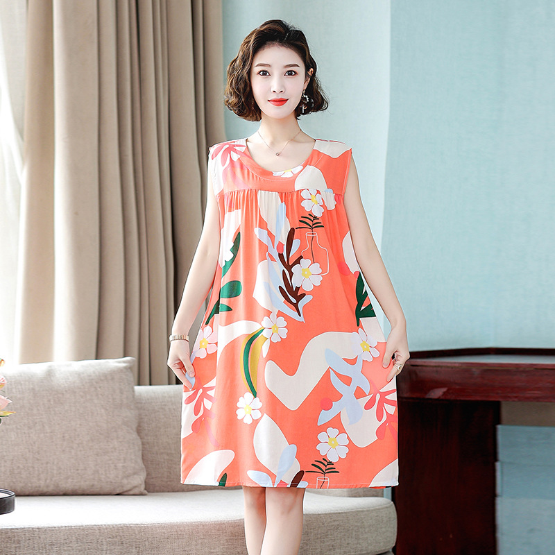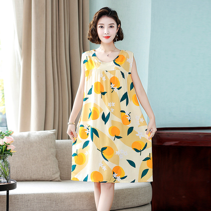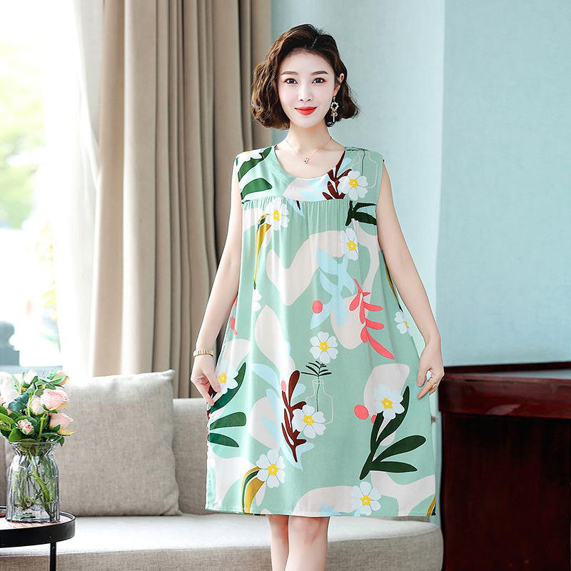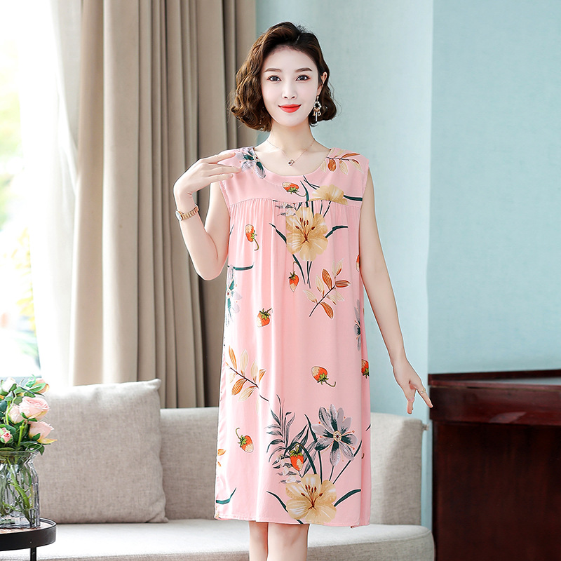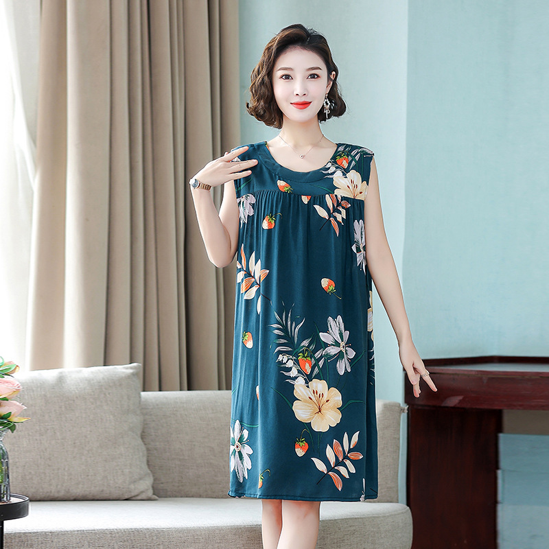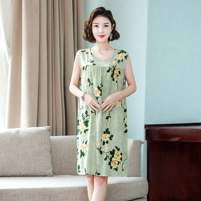 면 실크 잠옷 여자의 여름 중년 및 노인 잠옷 인조 면 민소매 원피스 중간 길이 캐주얼 가정 옷 어머니의 옷스토어 가기