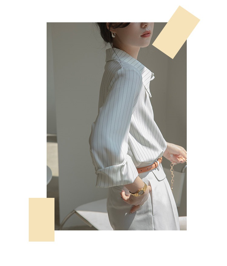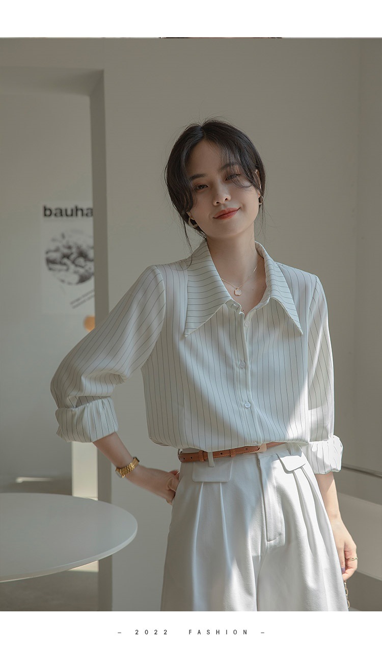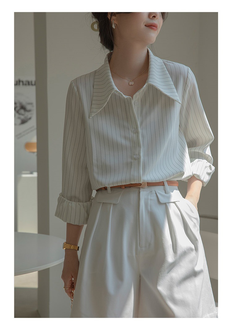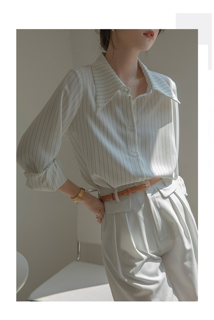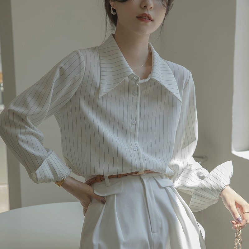 여성용 스트라이프 긴팔 셔츠, 봄 스타일, 가볍고 성숙한 스타일, 유니콘 프로페셔널 솔트 화이트 셔츠, 프렌치 젠틀 탑스토어 가기