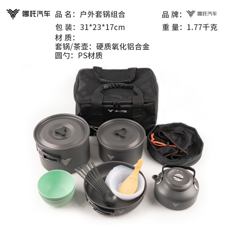 清单:大锅*1,小锅*1,煎锅*1,茶壶*1,竹粉碗*2,OPP碗*6,圆勺*6,网袋*1,手提包*1