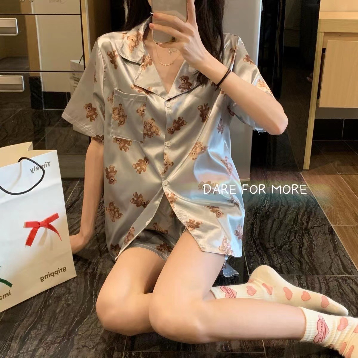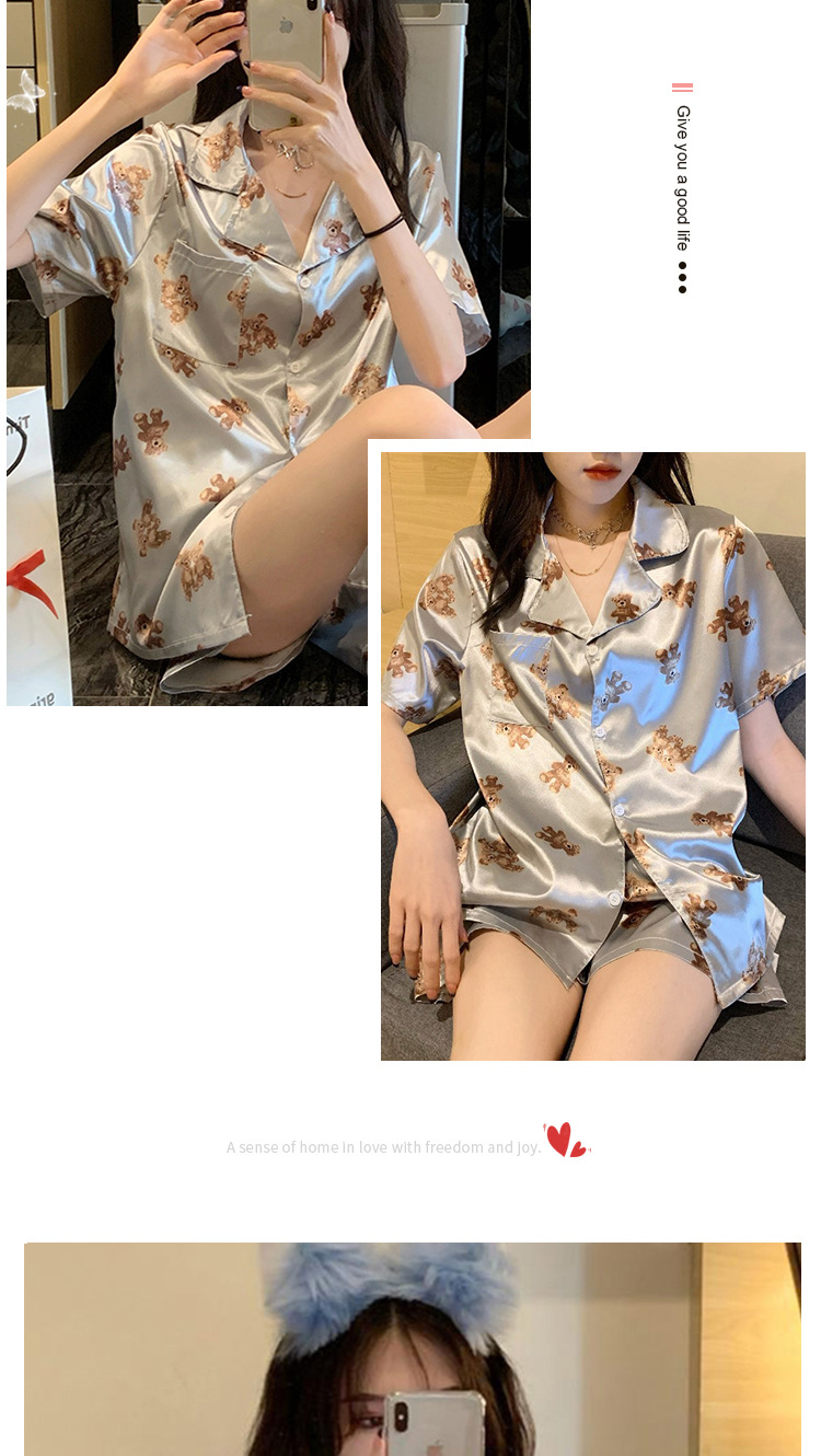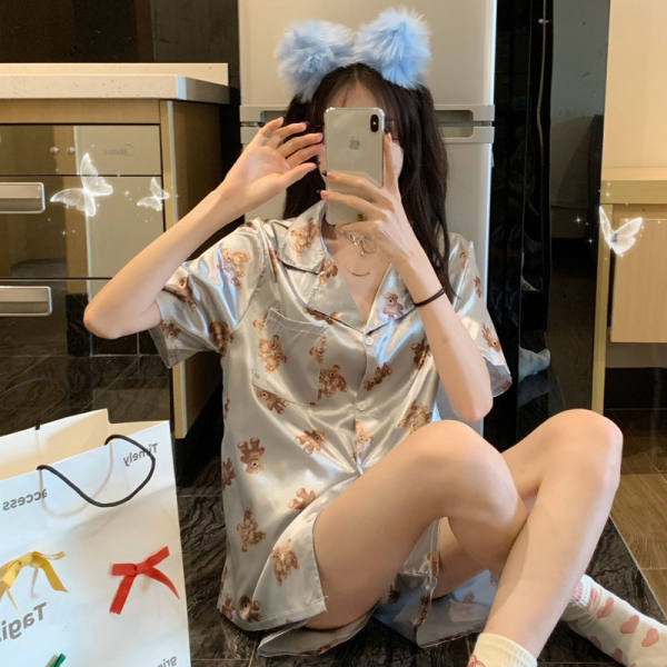 잠옷 여자의 반팔 카디건 반바지 회색 곰 귀여운 만화 여름 숙녀 가정 옷 세트 도매스토어 가기