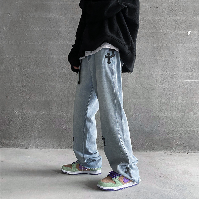 미국 복고풍 청바지 남성 봄과 가을 새로운 하이 스트리트 다크 크로스 스트레이트 와이드 레그 팬츠 패션 브랜드 걸레 바지스토어 가기