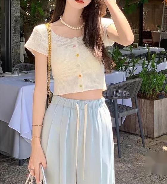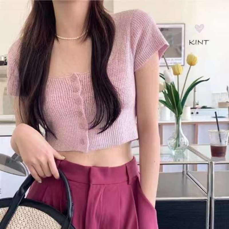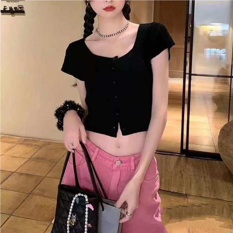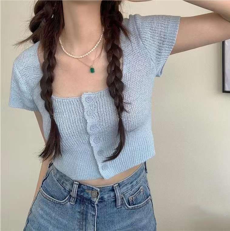2024 여름 신상 달콤하고 매혹적인 스퀘어넥 솔리드 컬러 슬림핏 허리라인 숏 니트 탑 여성용스토어 가기