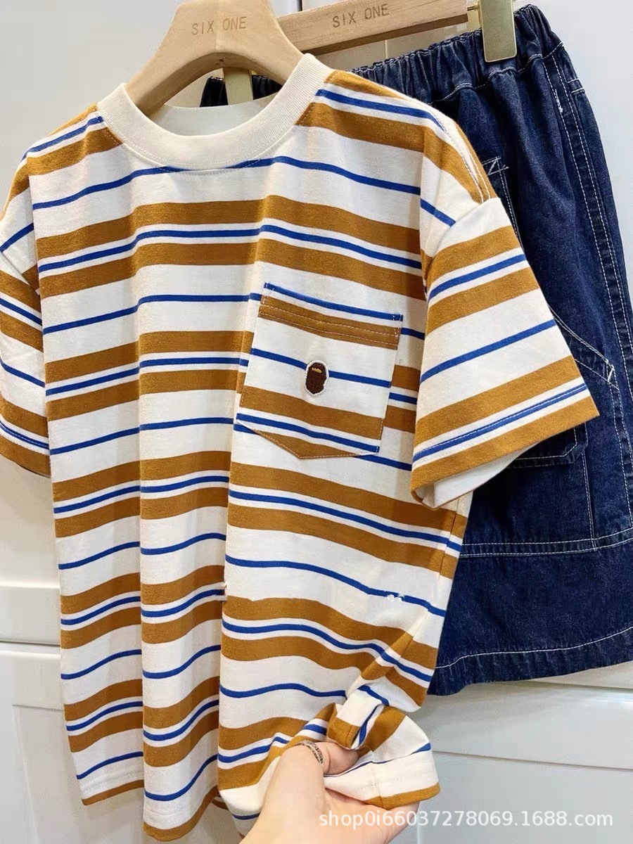 소년 아기 소년의 얕은 커피 중간 고대 줄무늬 반팔 소녀 자수 라벨 느슨한 티셔츠 여름베이스 셔츠 최고 트렌디스토어 가기