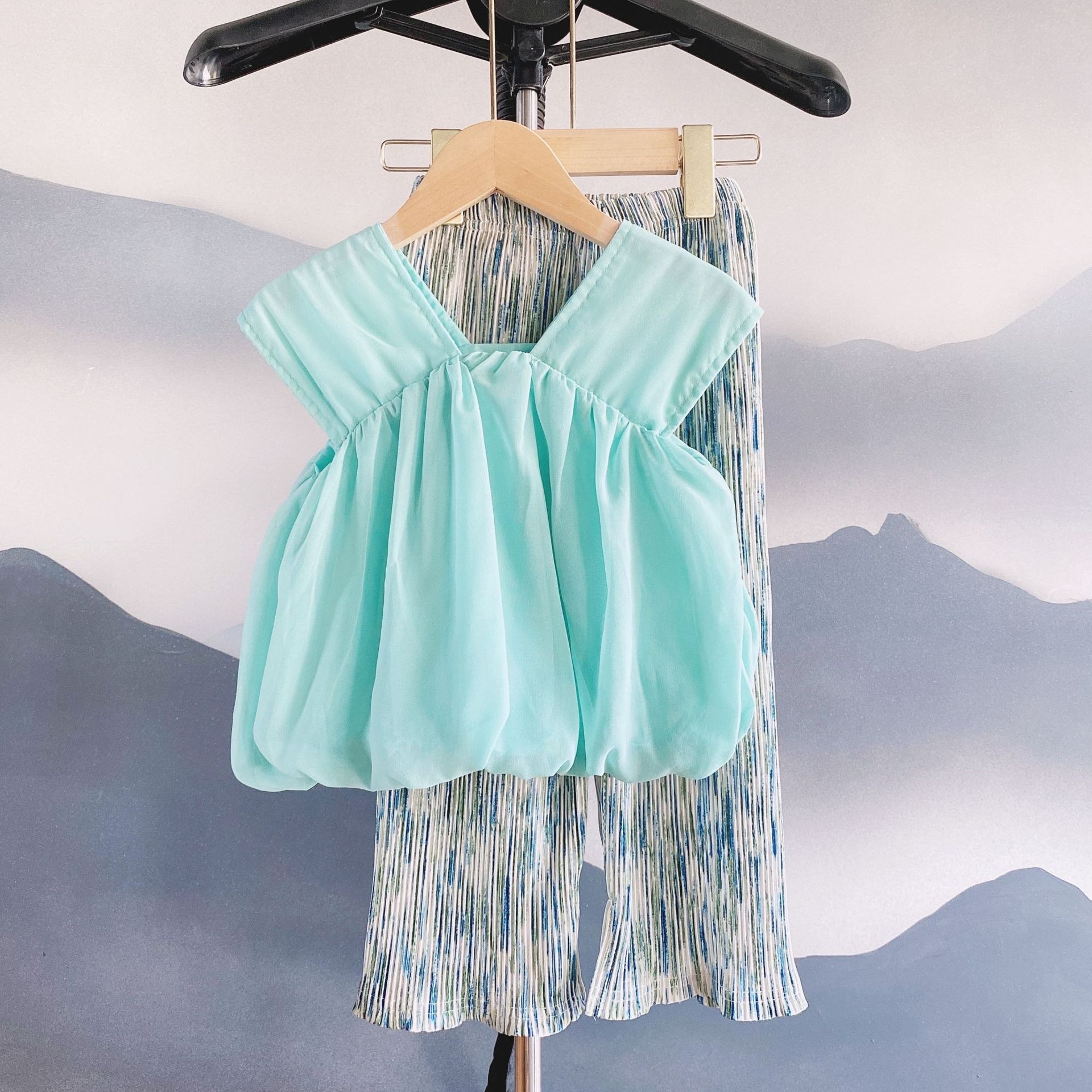 아이 르 토끼 2022 여름 새로운 여아 세트 한국 패션 조끼 물결 와이드 레그 팬츠 투피스 세트