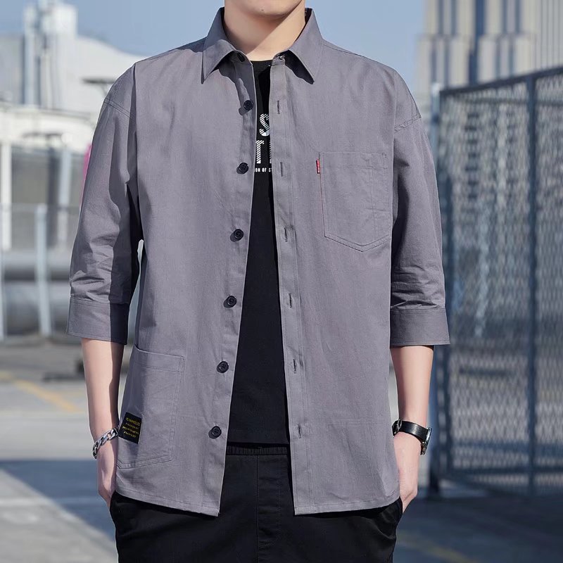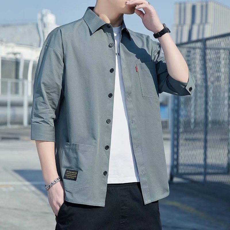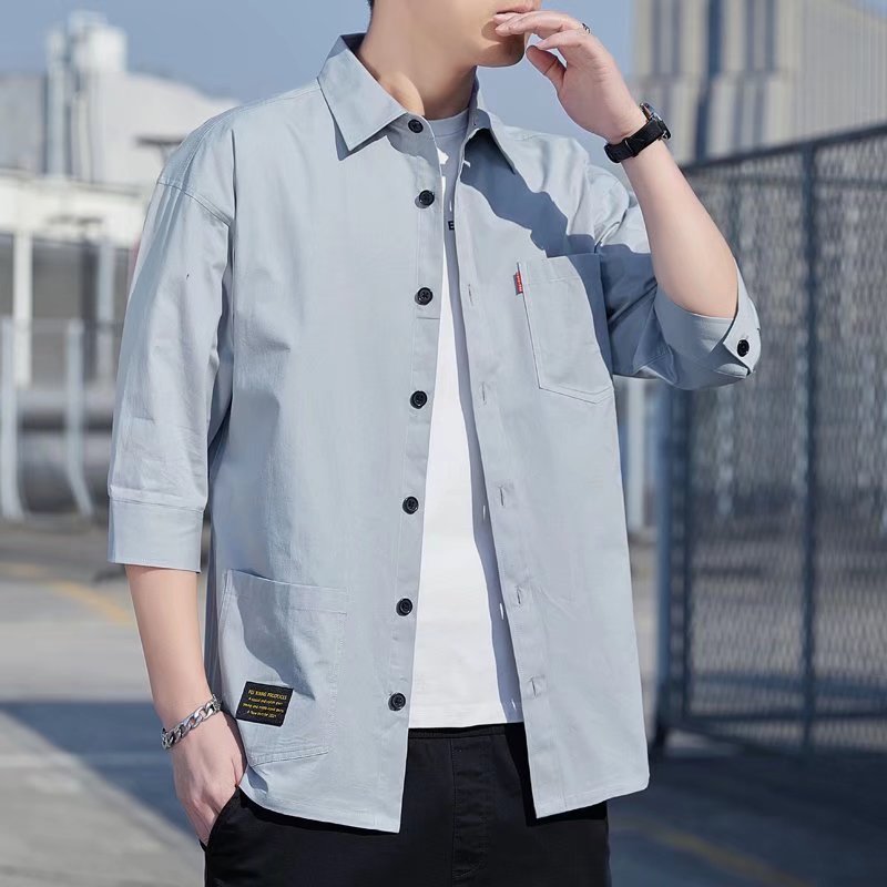 여름 신상품 크롭 슬리브 남자 셔츠 한국 스타일 유행 고치기 셔츠 복고풍 옷깃 캐주얼 남성용 슬림핏 탑스토어 가기