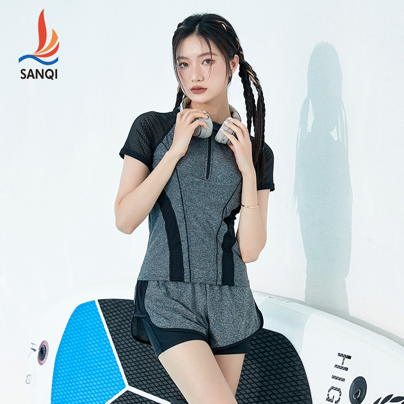 Sanqi 학생 수영복 여성용 바디 쉐이핑 보수적 인 반팔 스플릿 플랫 코너 배꼽 덮기 슬림 2022 새로운 서핑 수영복스토어 가기