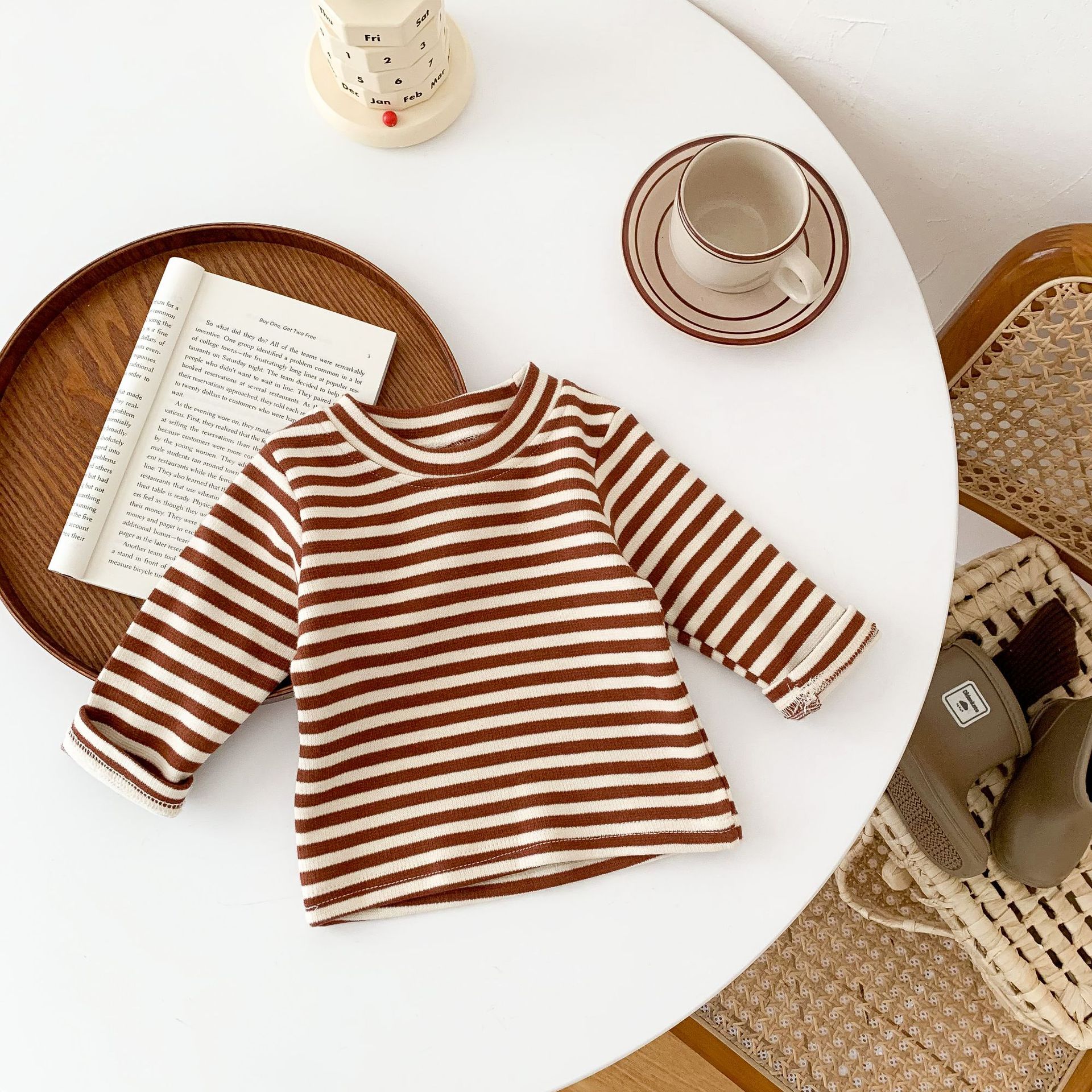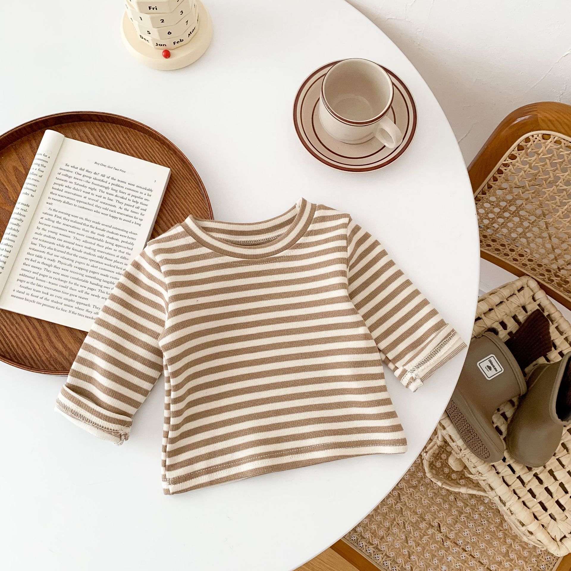 레트로 스트라이프 한국식 어린이 바닥 셔츠 2022 가을 새 소년 소녀 스트라이프 긴 소매 티셔츠 탑 웨스턴 스타일스토어 가기