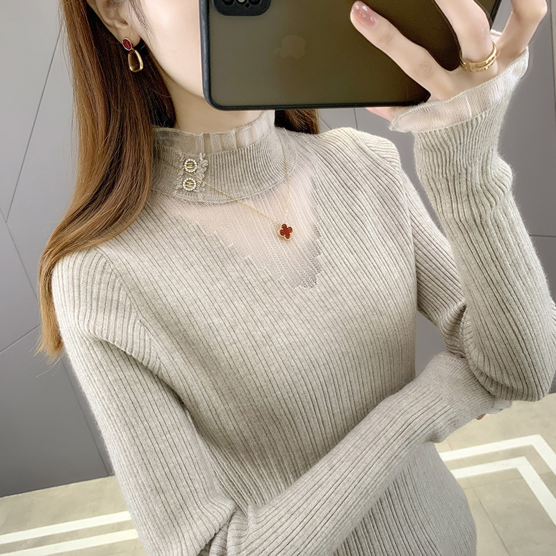 라운드넥 풀오버 니트 여성용 2024 봄 신상 슬림핏 레이스 스웨터 이너웨어 패셔너블한 베이스 레이어