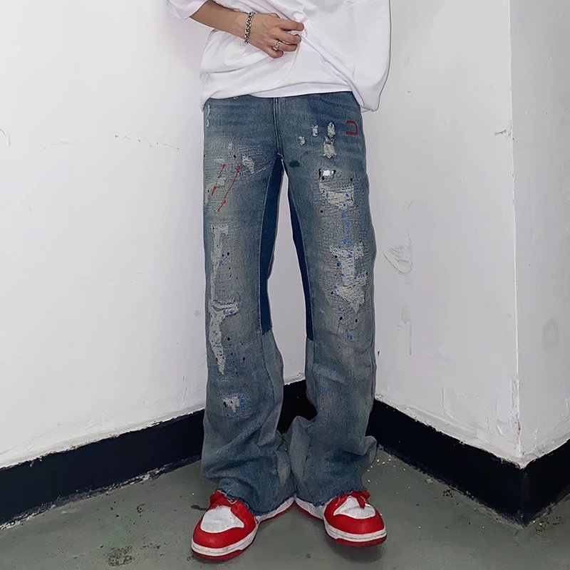 2022 in Tide 브랜드 하이 스트리트 유럽 및 미국 영어 자수 찢어진 복고풍 청바지 바지 남성용 나이프 컷 바지