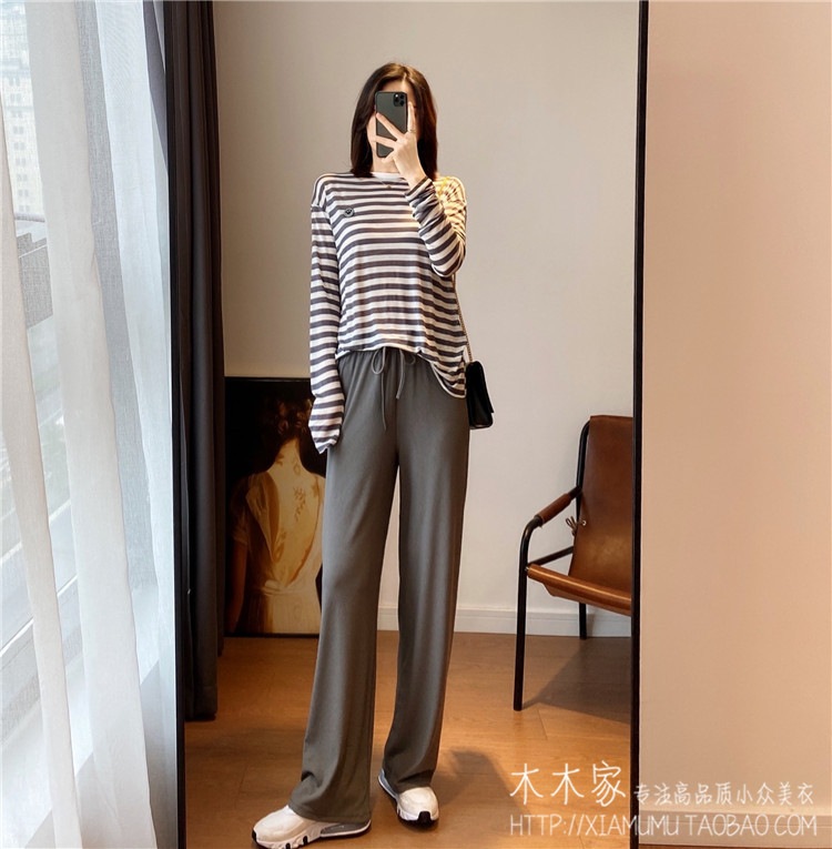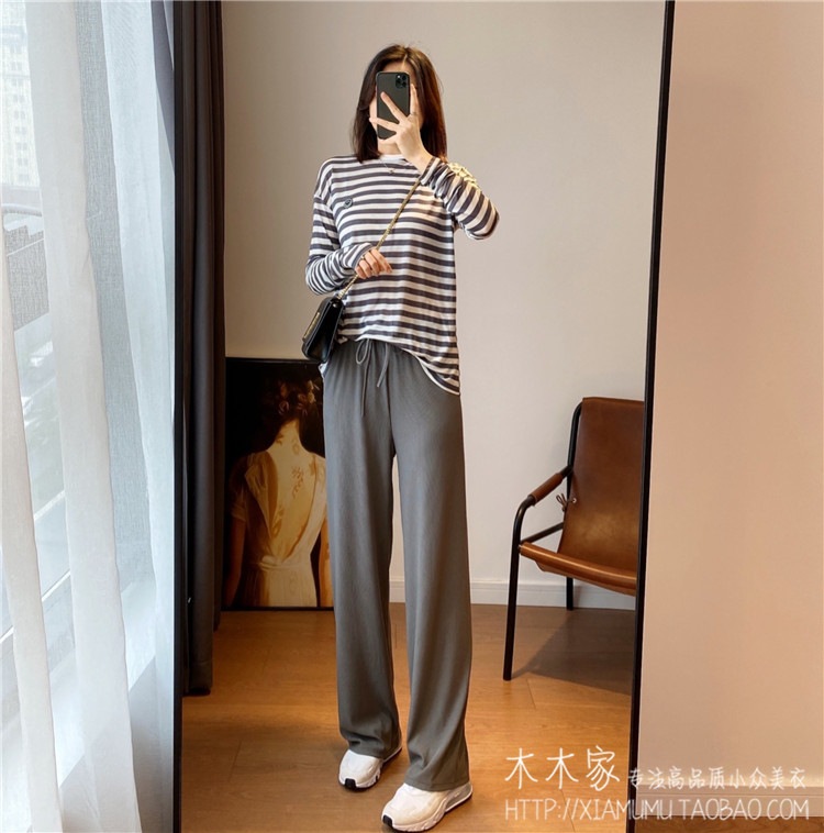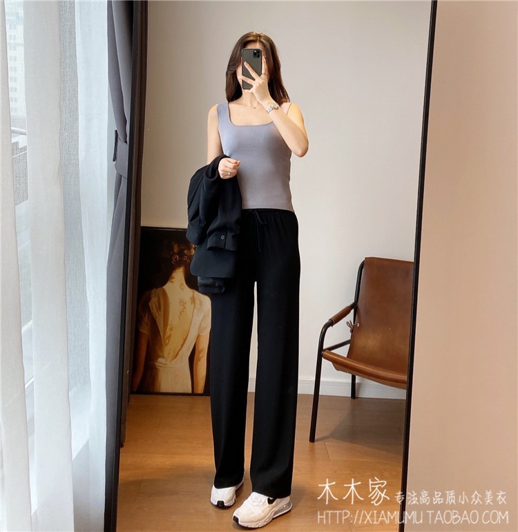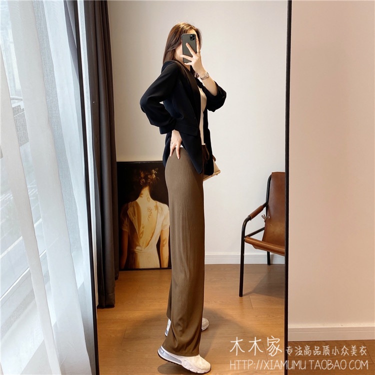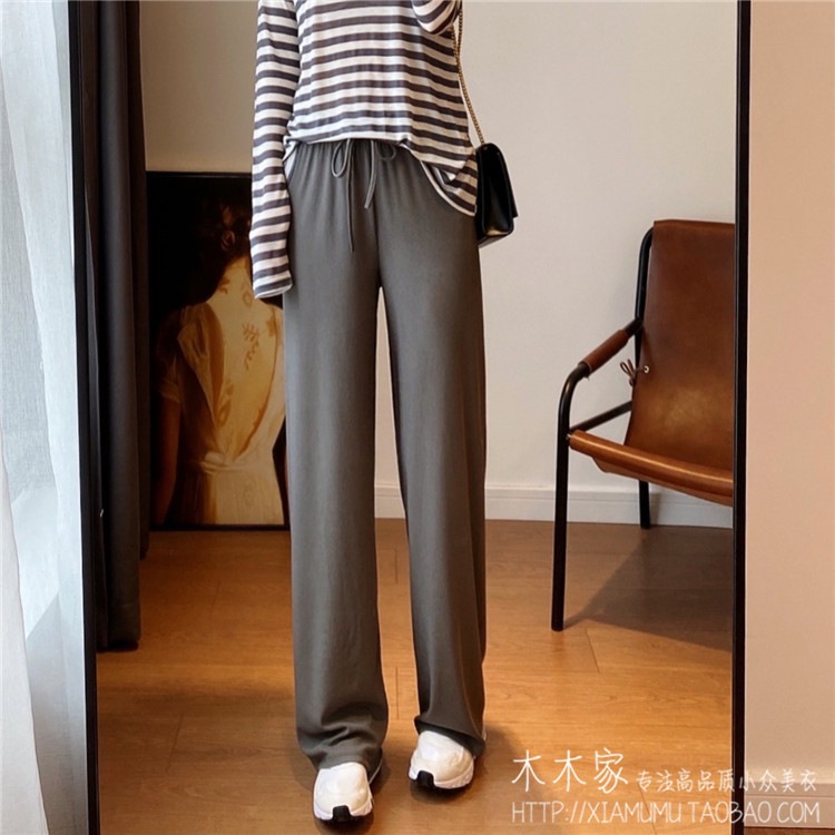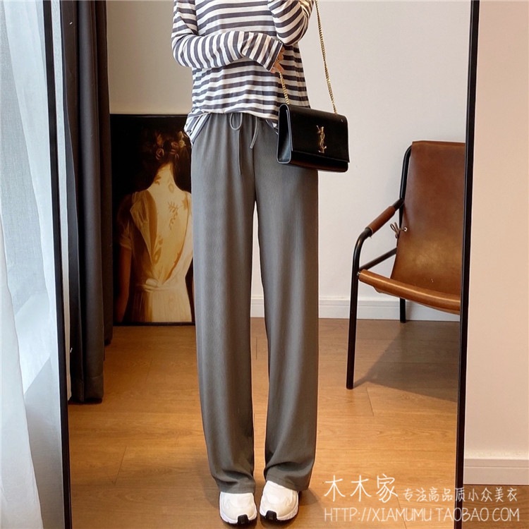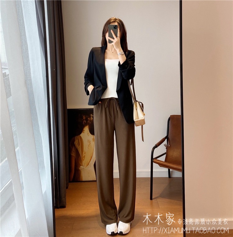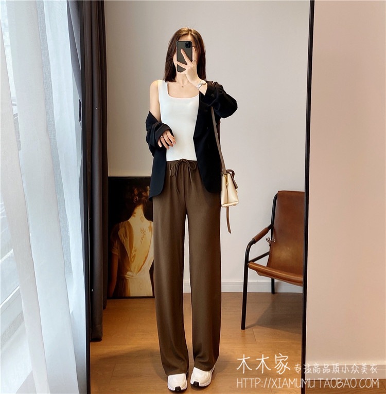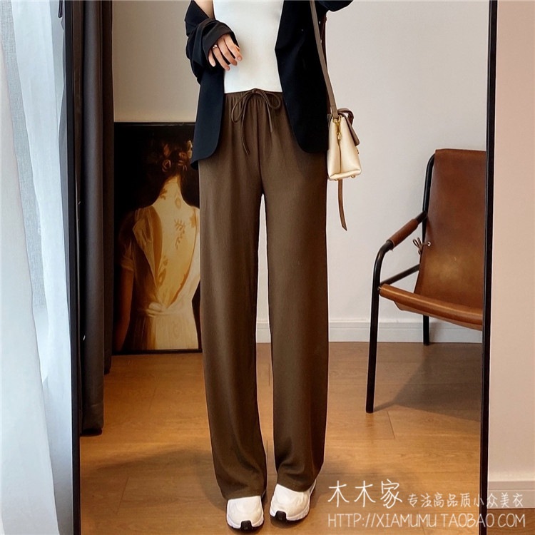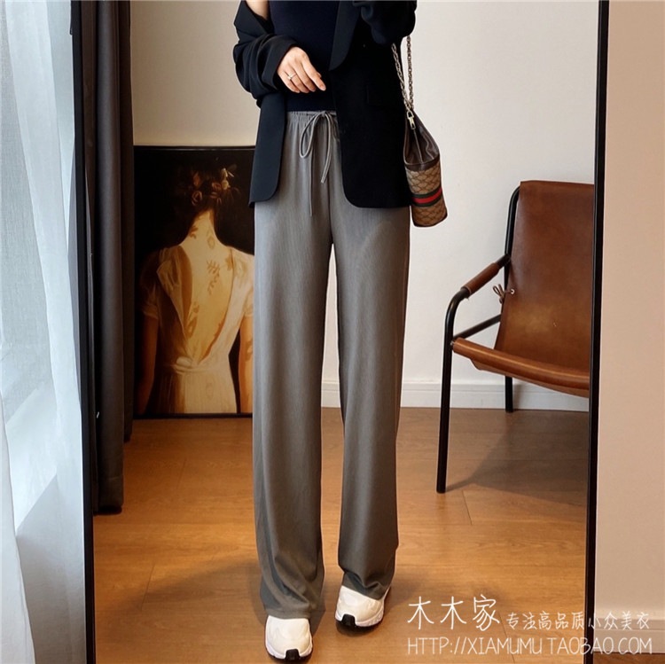 145 Little Man Drawstring High Waist Threaded 넓은 다리 바지 여성용 봄과 여름 담그는 캐주얼 바지