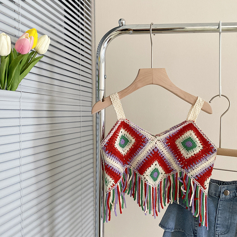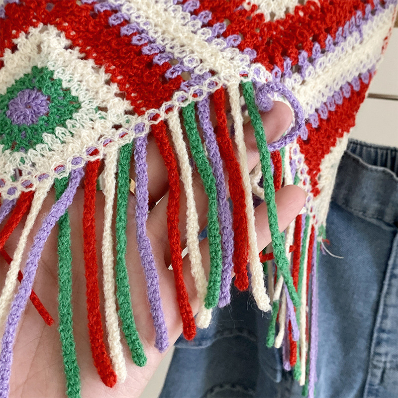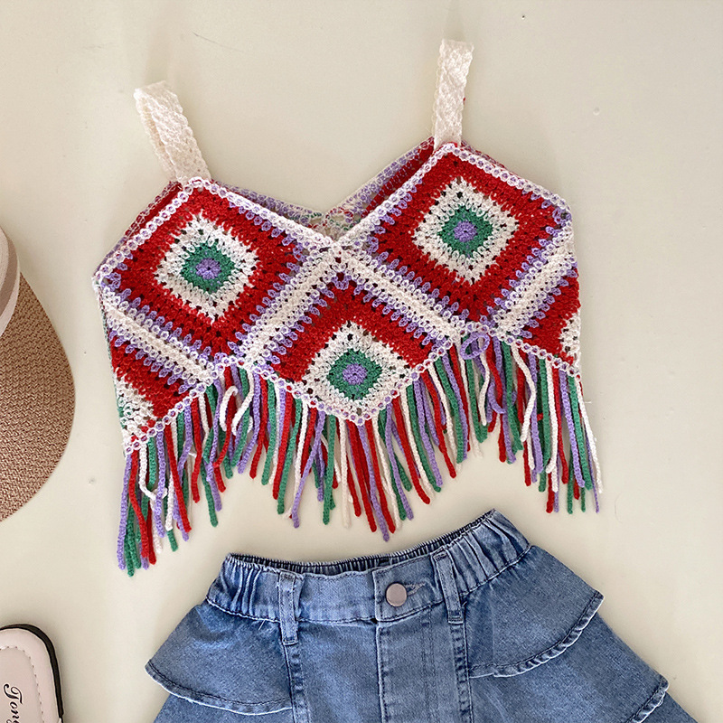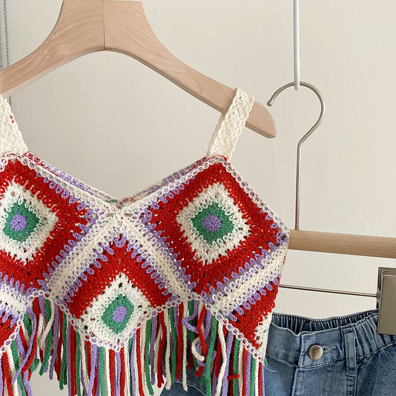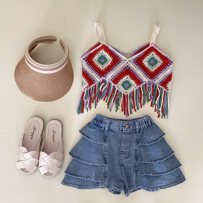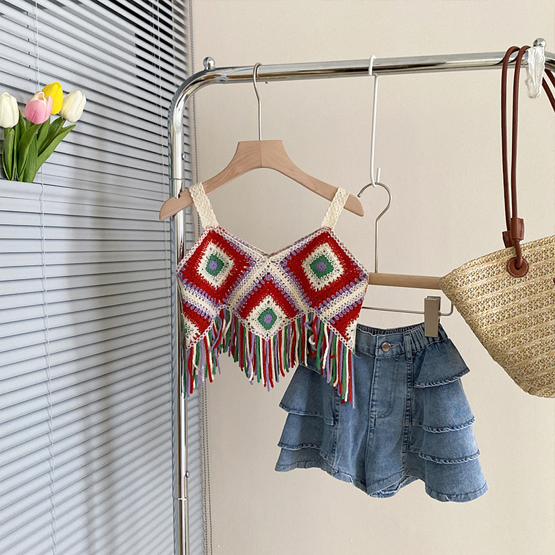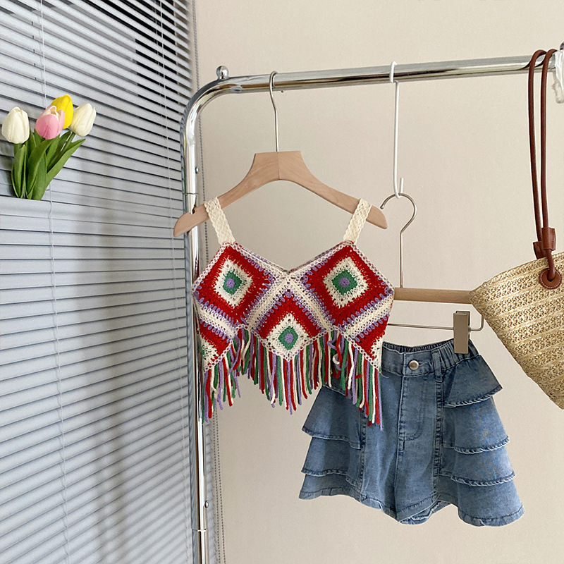 소녀의 세트 중공 니트 짧은 술 캐미솔 에스닉 스타일 탑 얇은 케이크 스커트 투피스 세트