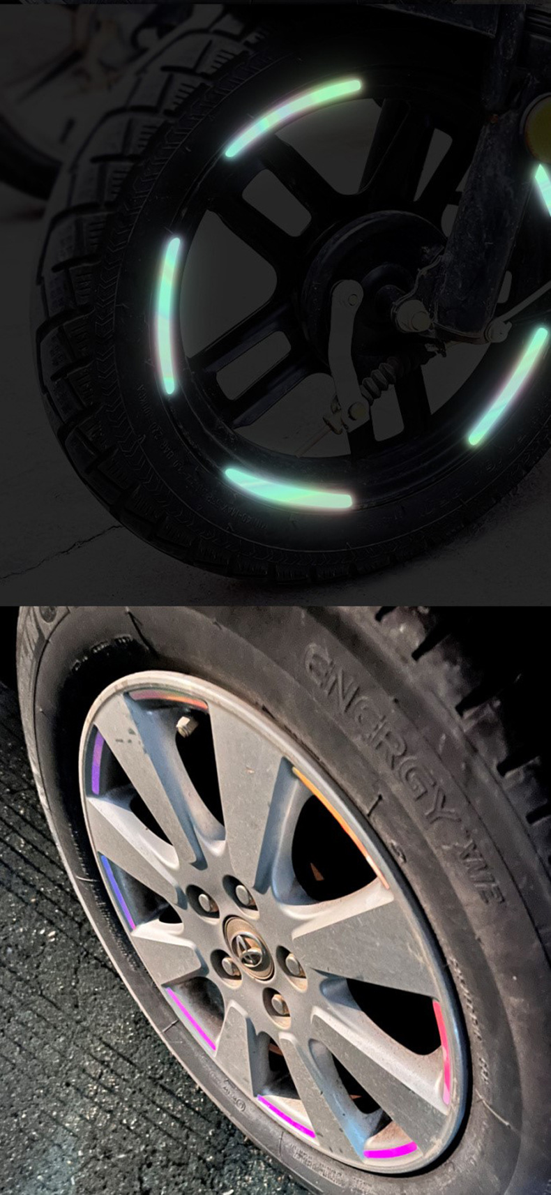 새로운 자동차 무지개 바퀴 허브 반사 스티커 개인화 된 창조적 인 오토바이 전기 자동차 스티커 빛나는 타이어 경고 장식