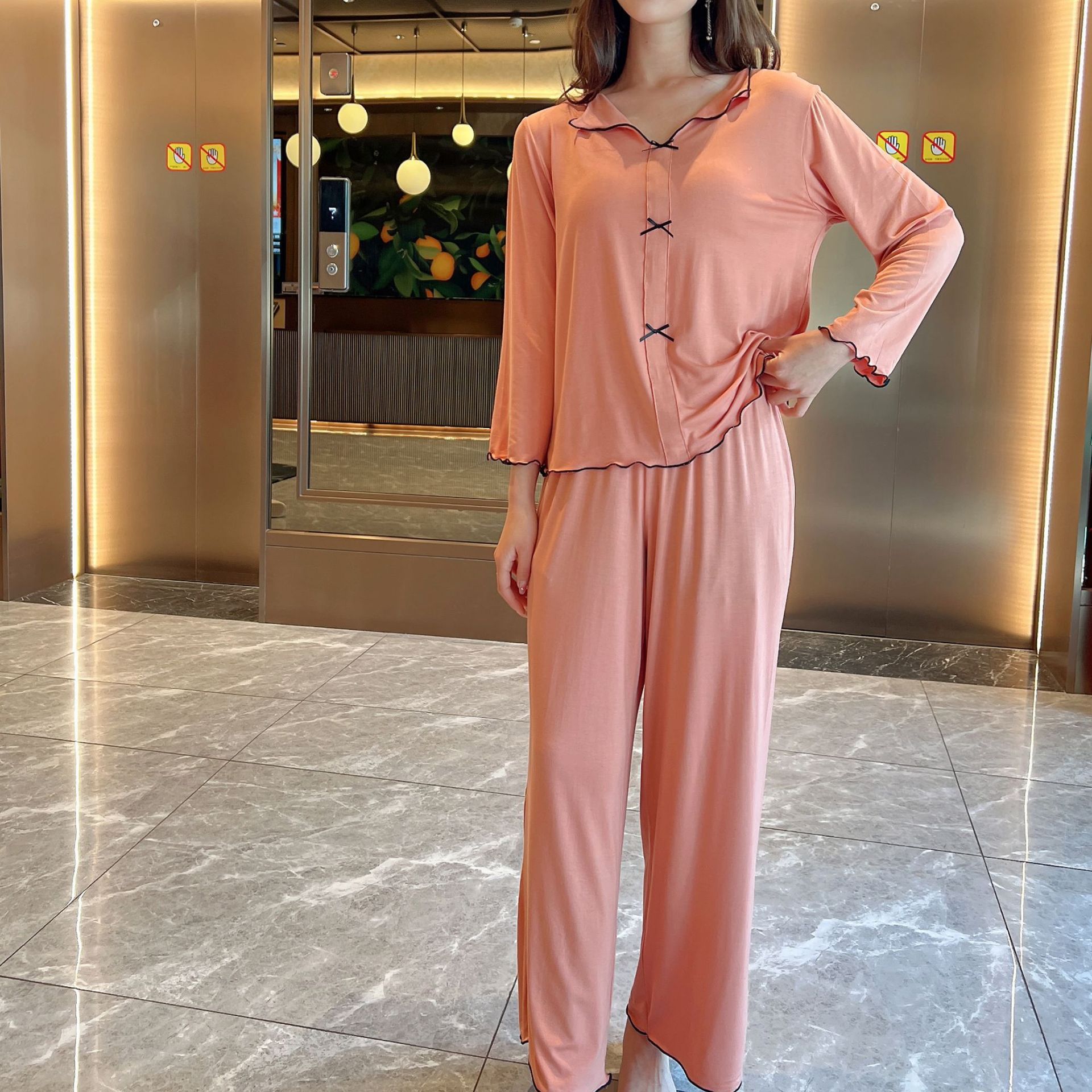 봄과 가을 달콤한 활 달콤한 홈 세트 긴 소매 바지 느슨한 대형 얇은 잠옷 투피스 세트스토어 가기