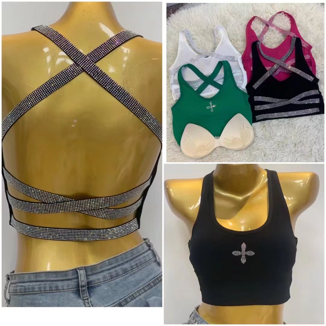 여름철 섹시한 여성들이 입는 섹시한 등이 드러나는 짧은 멀티 스트랩 디자인의 라텍스 컵탑, 패셔너블한 여성 의류 품질스토어 가기