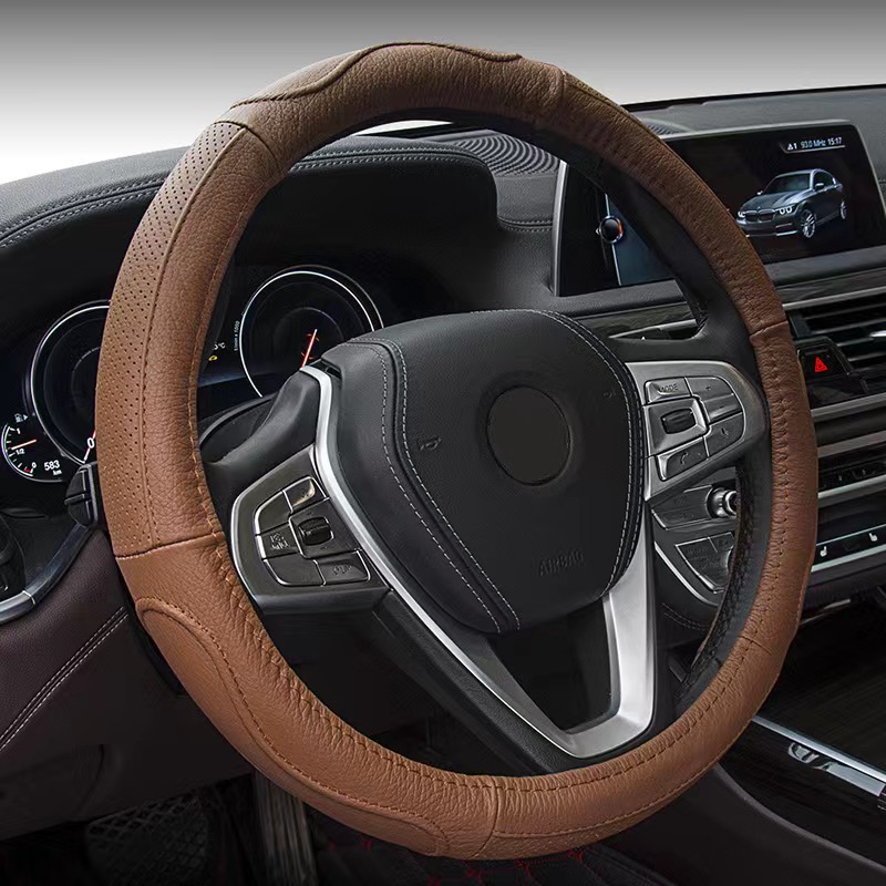2022 새로운 가죽 스티어링 휠 커버 헤드 레이어 소가죽 자동차 핸들 커버 바느질 통기성 사계절 유니버설 스티어링 휠 커버