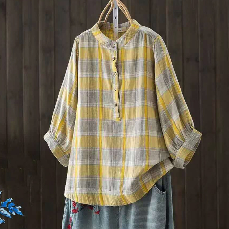 예술적 박쥐 소매 격자 무늬 이중 면사 중간 소매 셔츠 여성용 느슨한 셔츠 면 부드러운 반 소매 탑스토어 가기