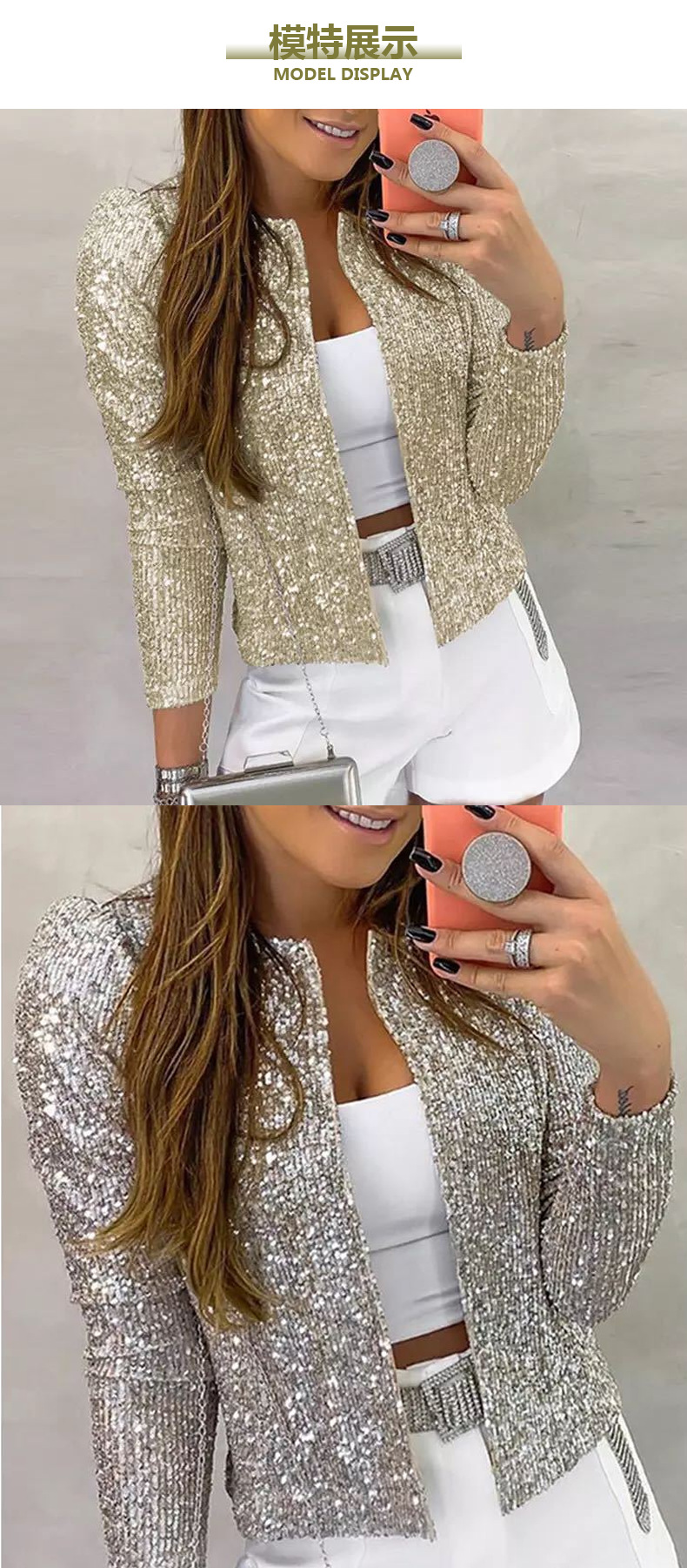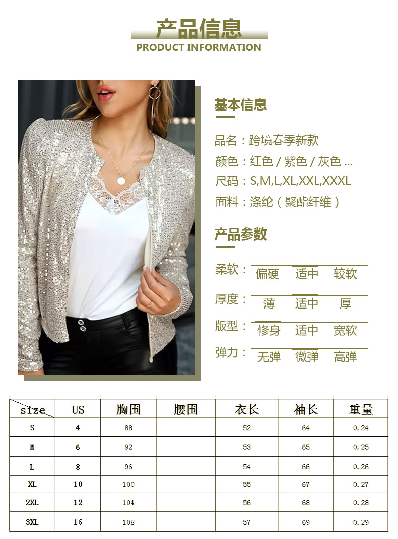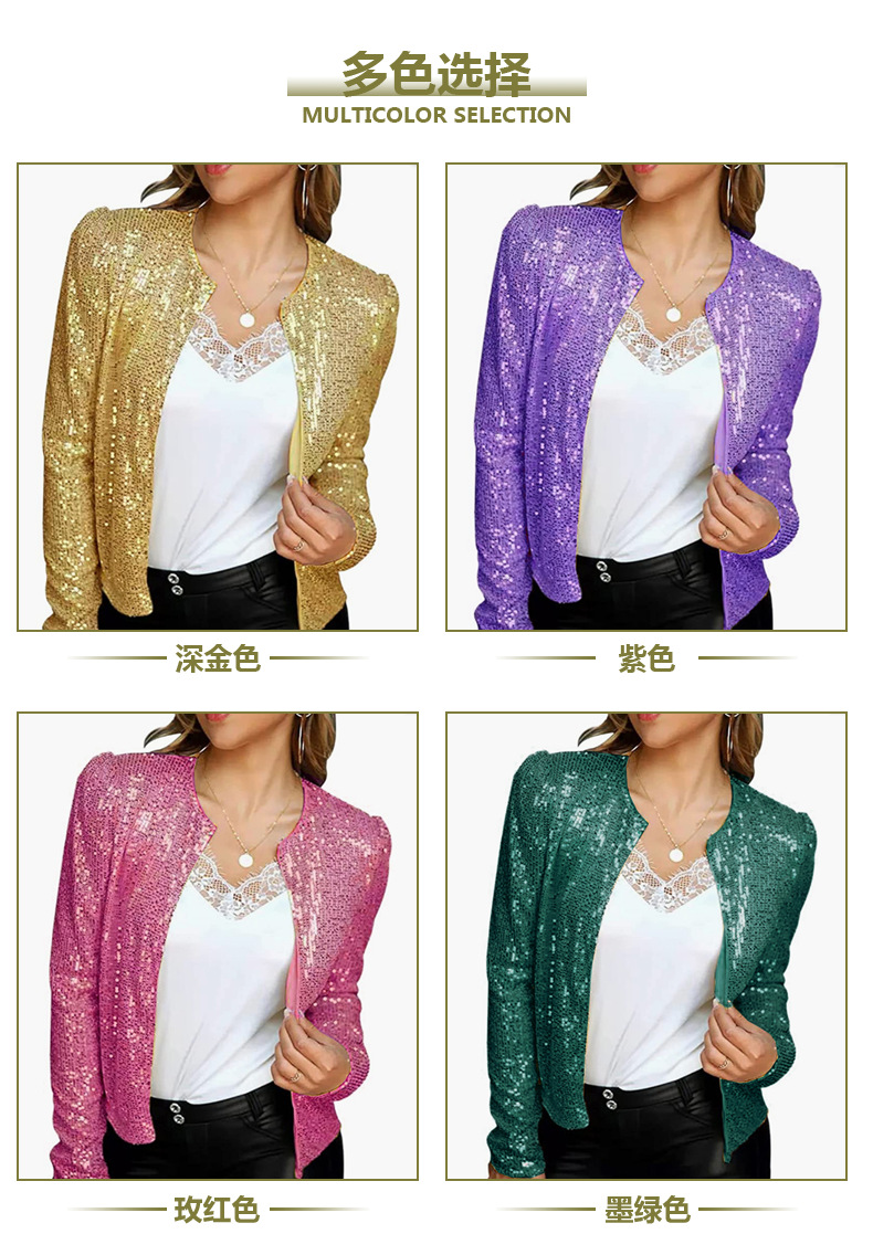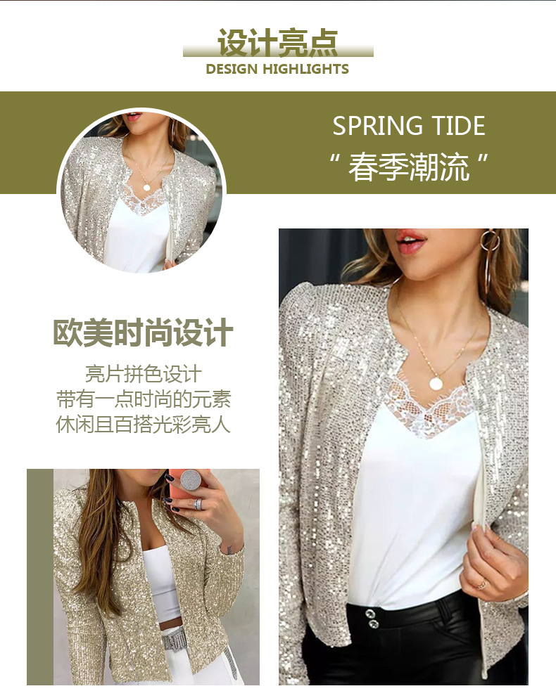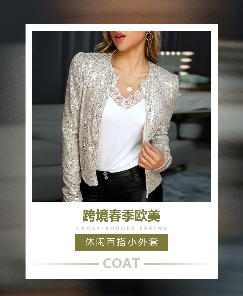 2025 국경 봄 새로운 유럽과 미국 패션 스탠드 칼라 컬러 차단 스팽글 재킷 짧은 캐주얼 다목적 작은 재킷스토어 가기