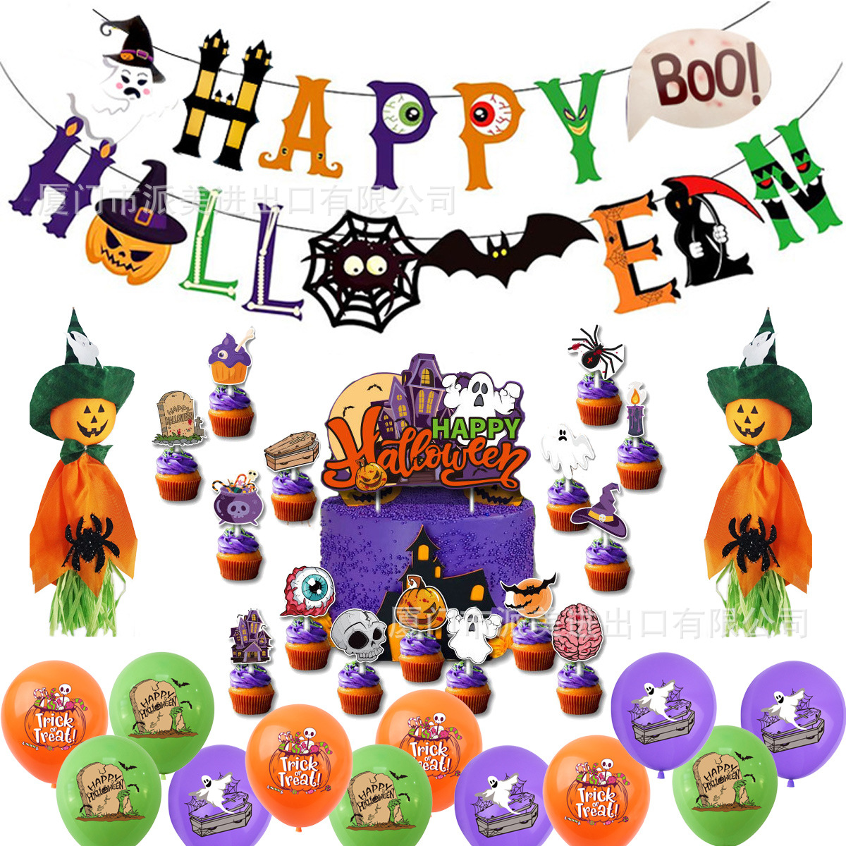 할로윈 테마 휴일 파티 장식 세트 깃발 당기기 케이크 깃발-풍선 교수형 장식 장소 레이아웃 소품 삽입