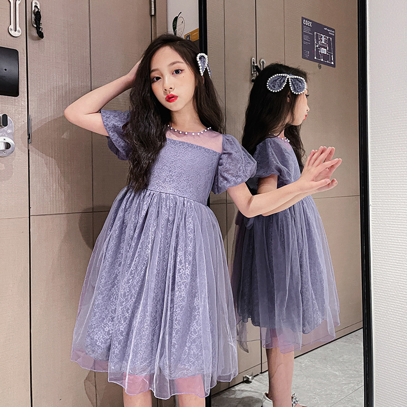 여아 레이스 원피스 여름 2022 새로운 하이 엔드 소녀의 메쉬 원피스 어린이 퍼프 슬리브 공주 원피스