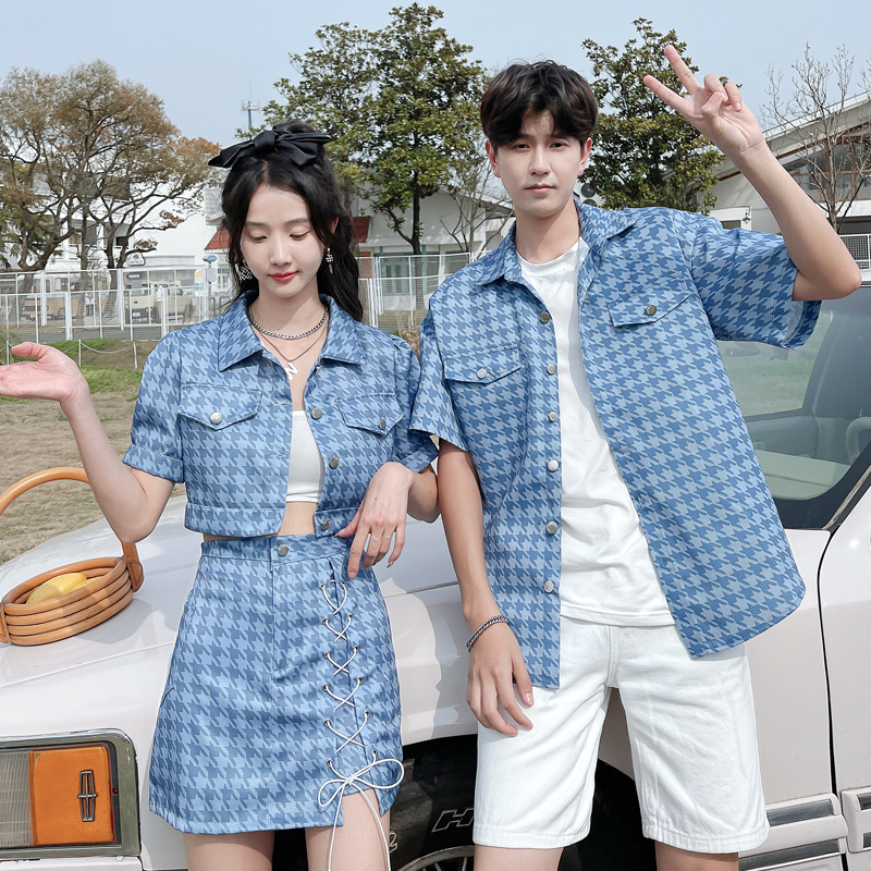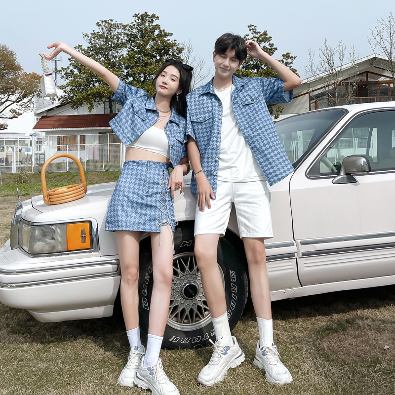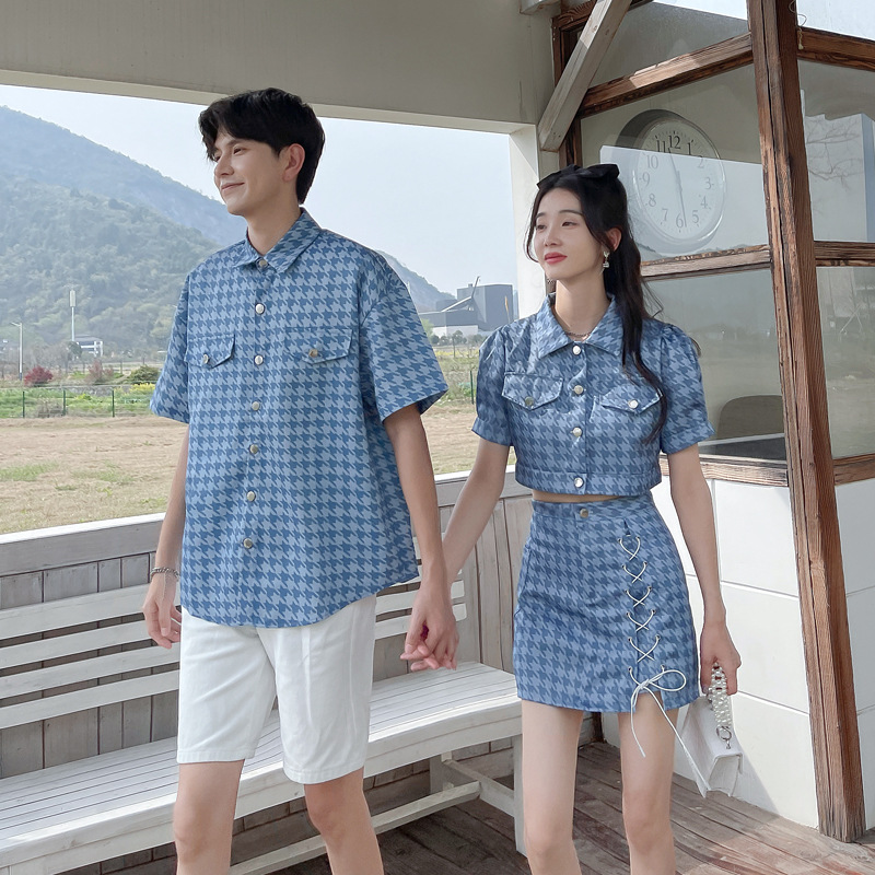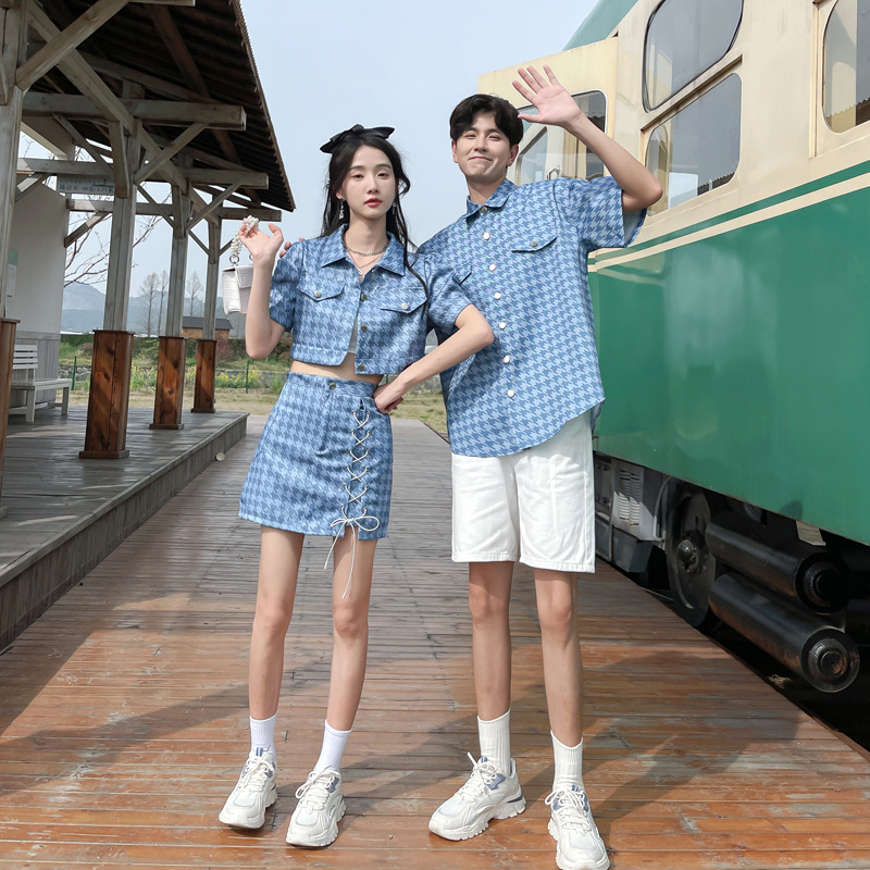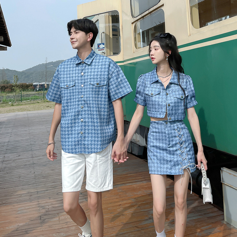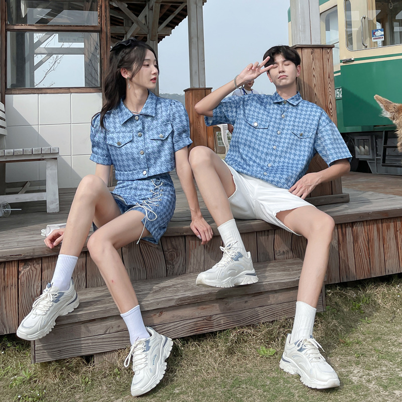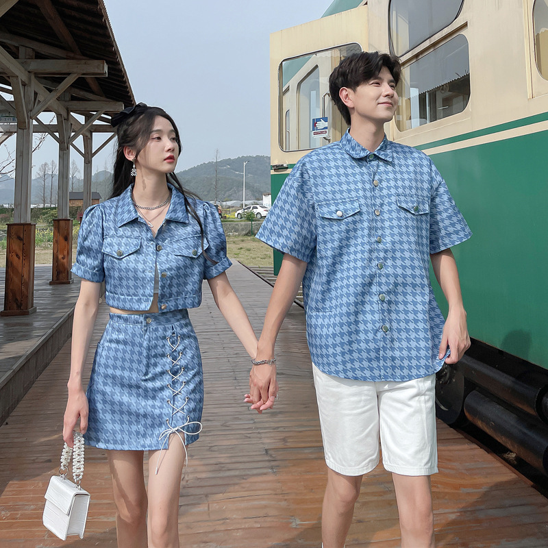 커플 여름 옷 2022 한국 스타일 새로운 블루 물떼새 격자 여성용 반팔 스커트 남성용 셔츠 정장스토어 가기