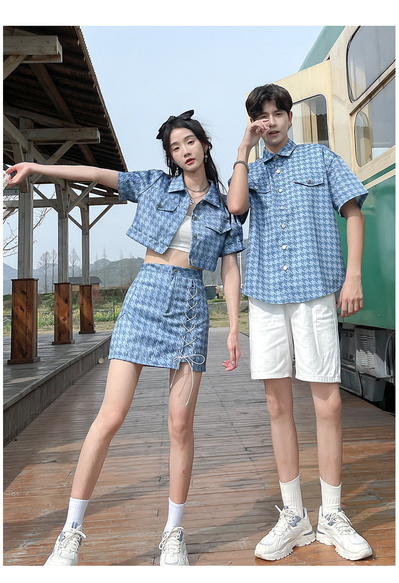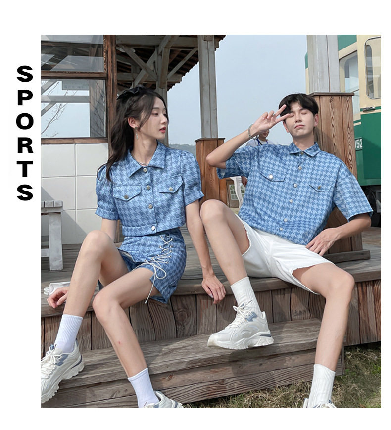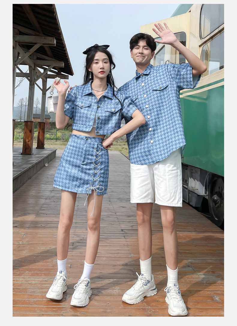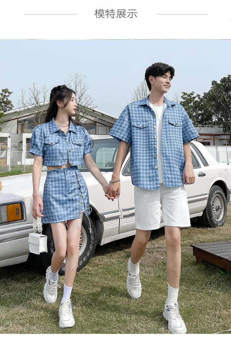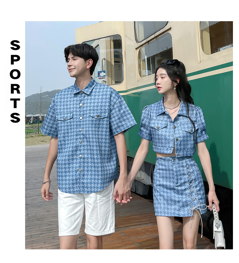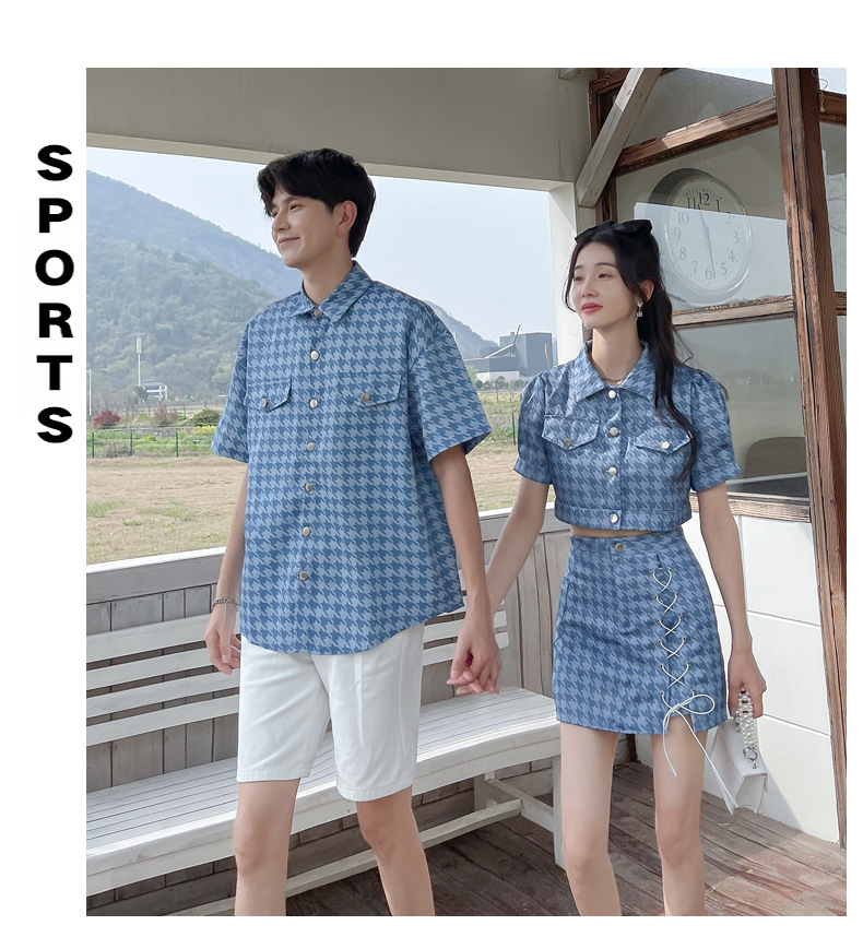 커플 여름 옷 2022 한국 스타일 새로운 블루 물떼새 격자 여성용 반팔 스커트 남성용 셔츠 정장스토어 가기