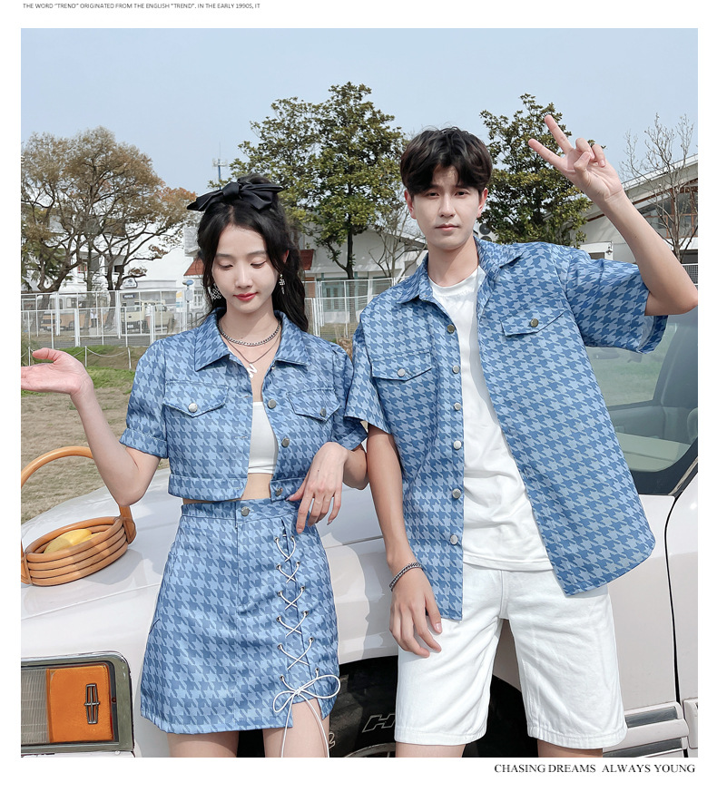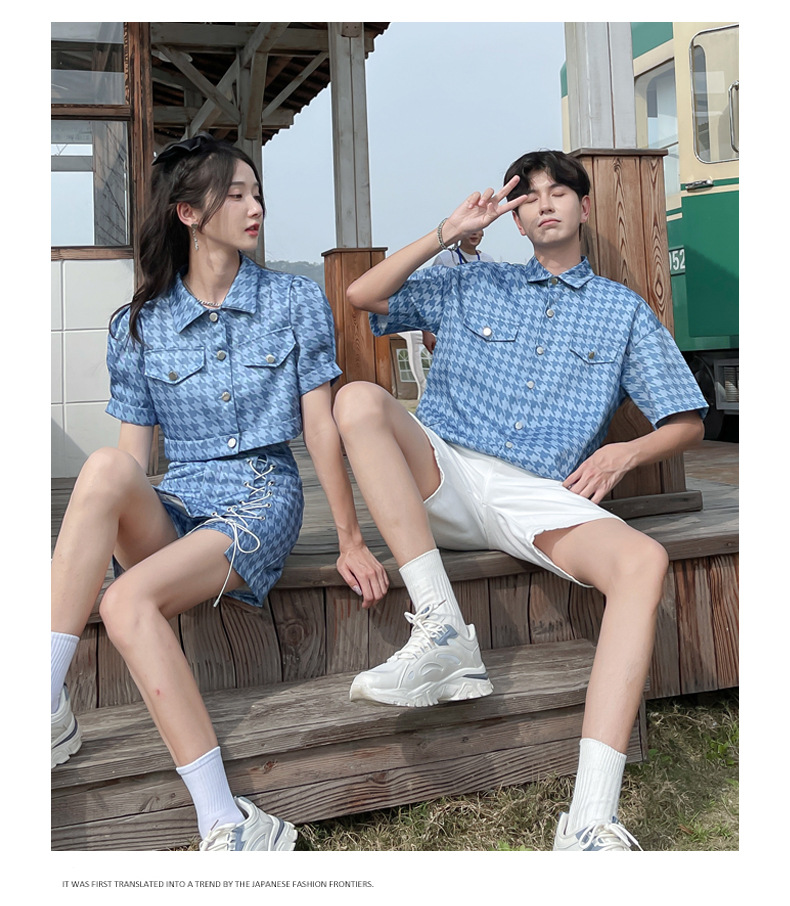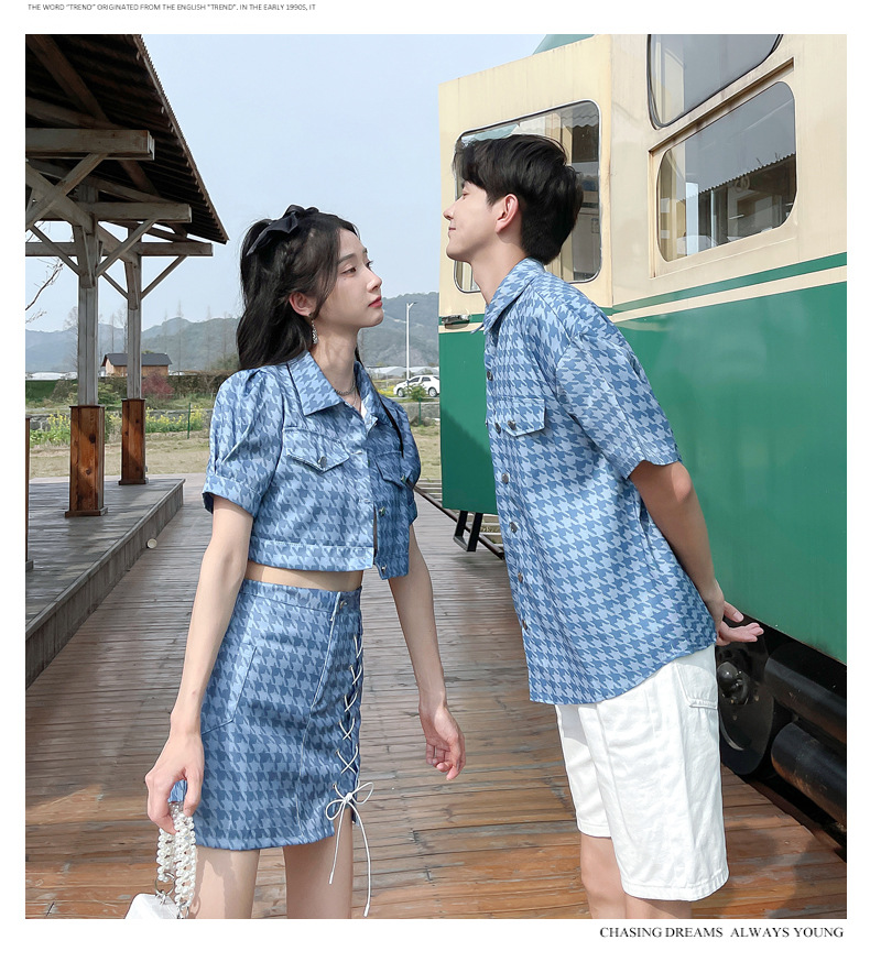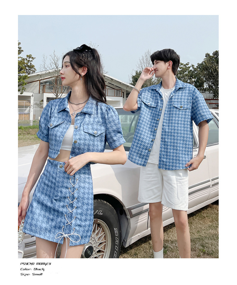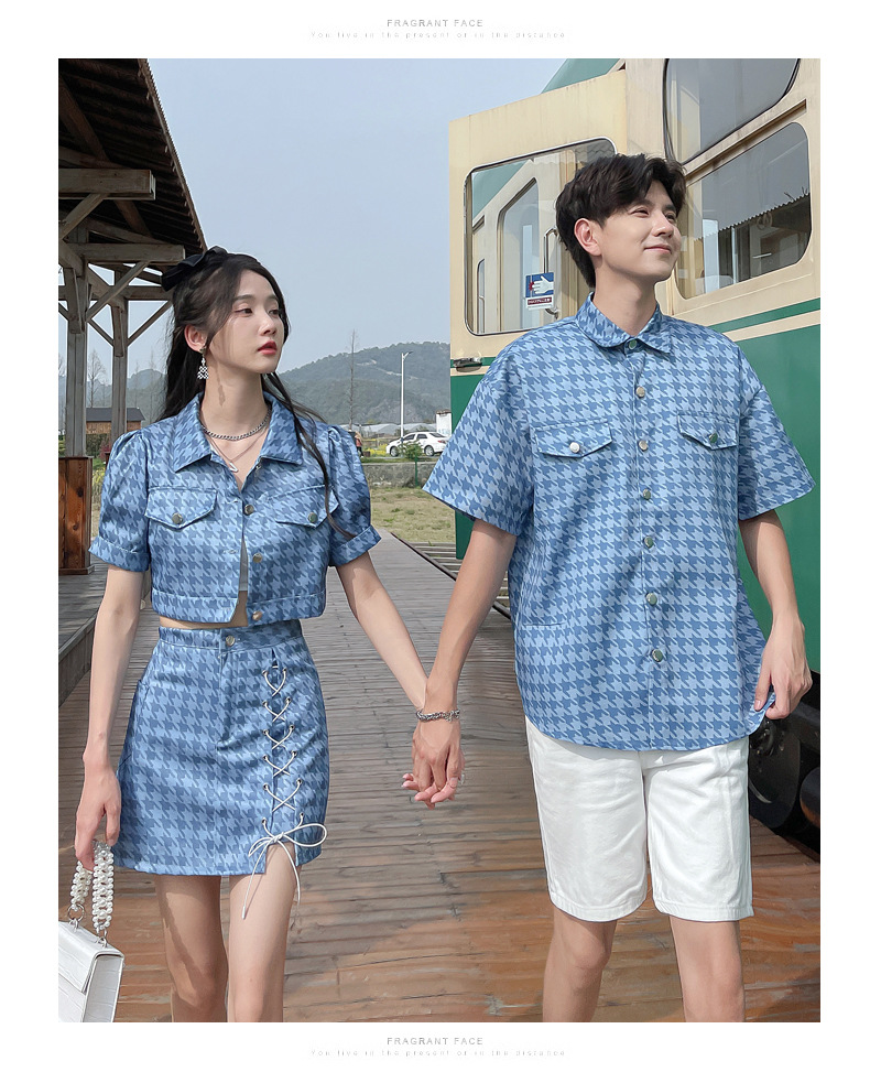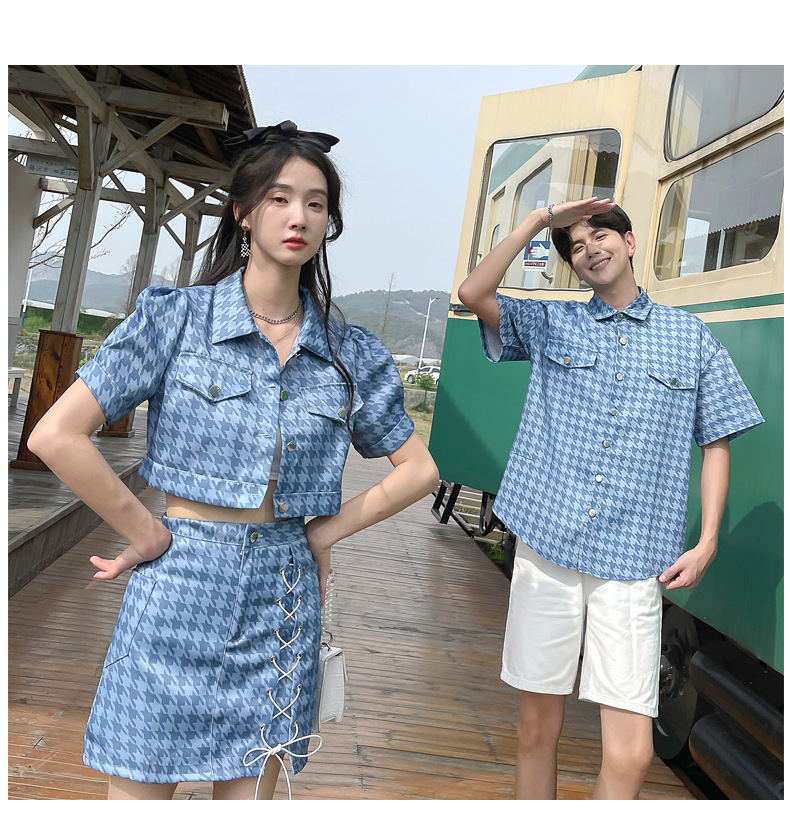 커플 여름 옷 2022 한국 스타일 새로운 블루 물떼새 격자 여성용 반팔 스커트 남성용 셔츠 정장스토어 가기