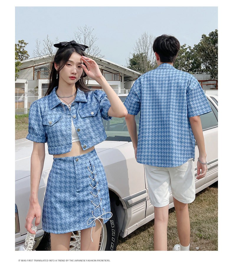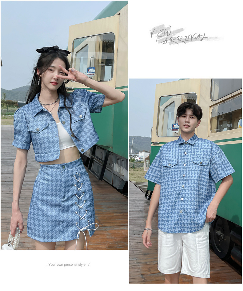 커플 여름 옷 2022 한국 스타일 새로운 블루 물떼새 격자 여성용 반팔 스커트 남성용 셔츠 정장