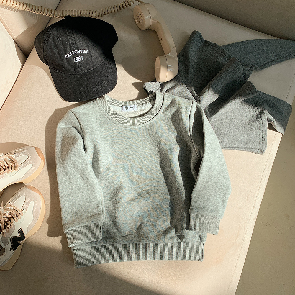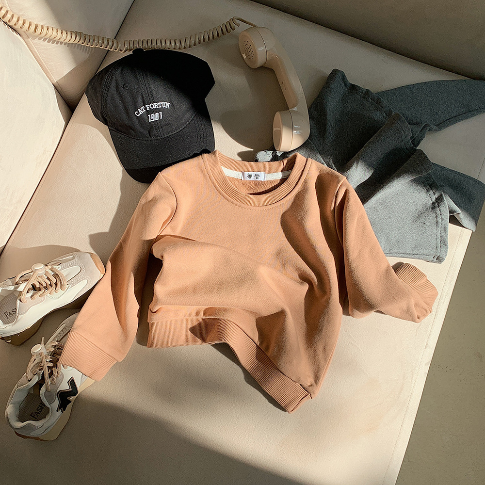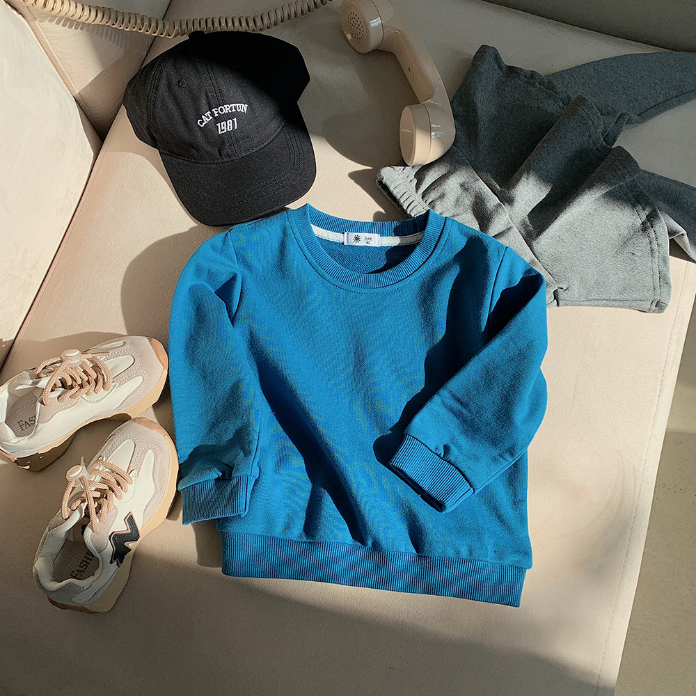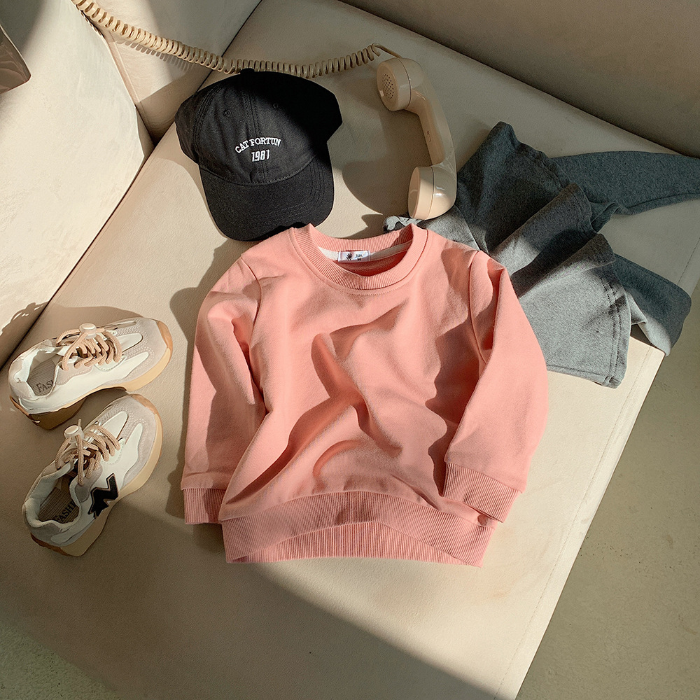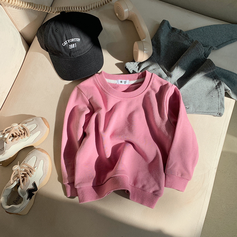 가을 2023 어린이 운동복 어린이 단색 라운드 넥 운동복 캔디 컬러 어린이 긴 소매 타원형 풀오버 탑스토어 가기