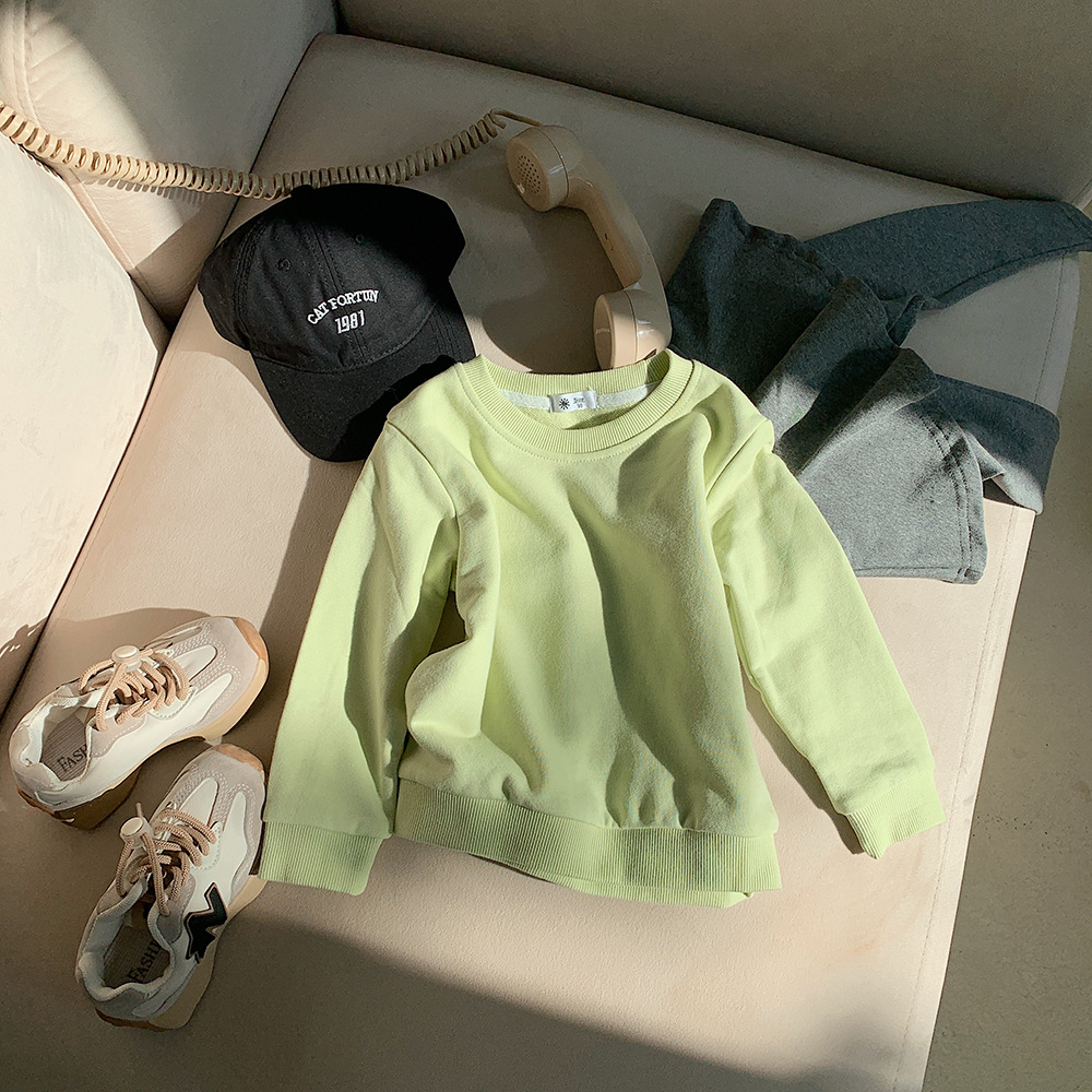 가을 2023 어린이 운동복 어린이 단색 라운드 넥 운동복 캔디 컬러 어린이 긴 소매 타원형 풀오버 탑
