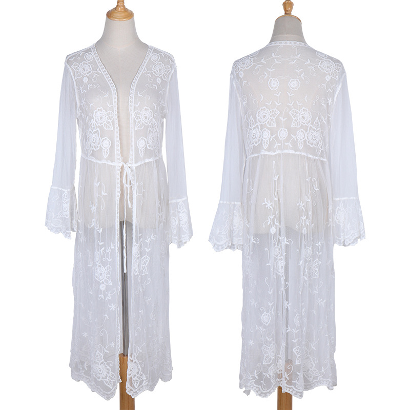 패션 니트 자수 여자의 흰색 긴 원피스 카디건 졸라매는 끈 디자인 대외 무역 뜨거운 트럼펫 소매 중간 길이 스커트