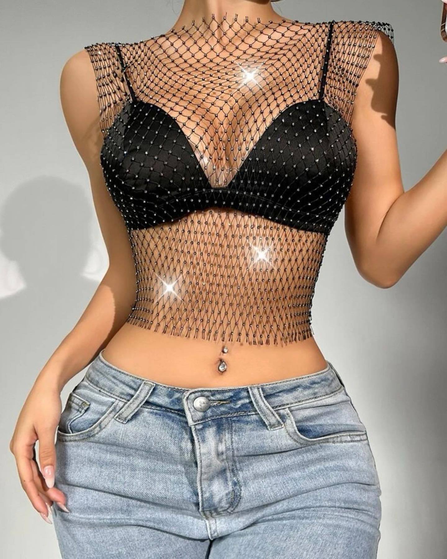 유럽 및 미국 여성 의류 라운드넥 긴팔 티셔츠 여성용 크리스탈 장식 망사 셔츠 이너웨어 여름 슬림핏 숏 스타일 트렌디스토어 가기