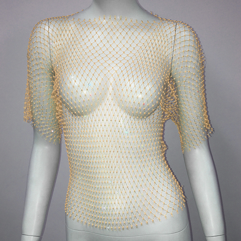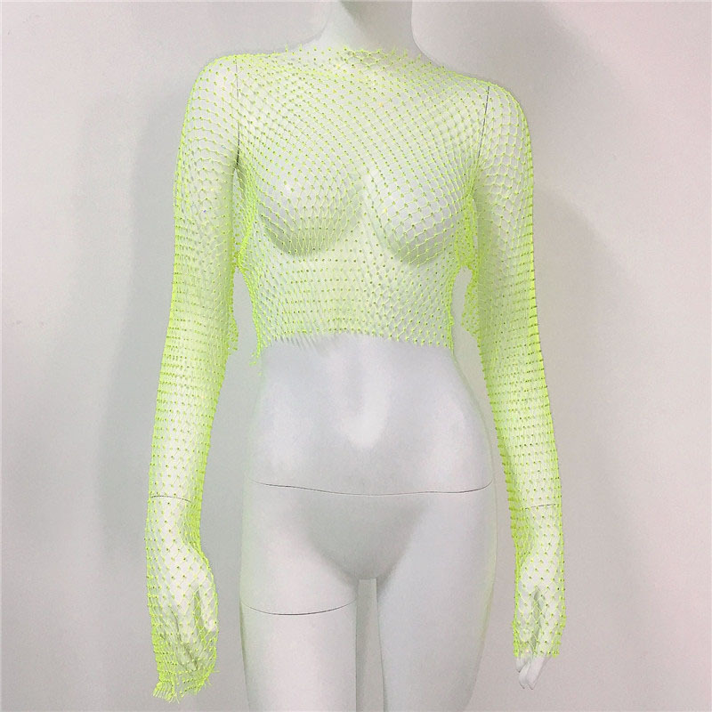 유럽 및 미국 여성 의류 라운드넥 긴팔 티셔츠 여성용 크리스탈 장식 망사 셔츠 이너웨어 여름 슬림핏 숏 스타일 트렌디
