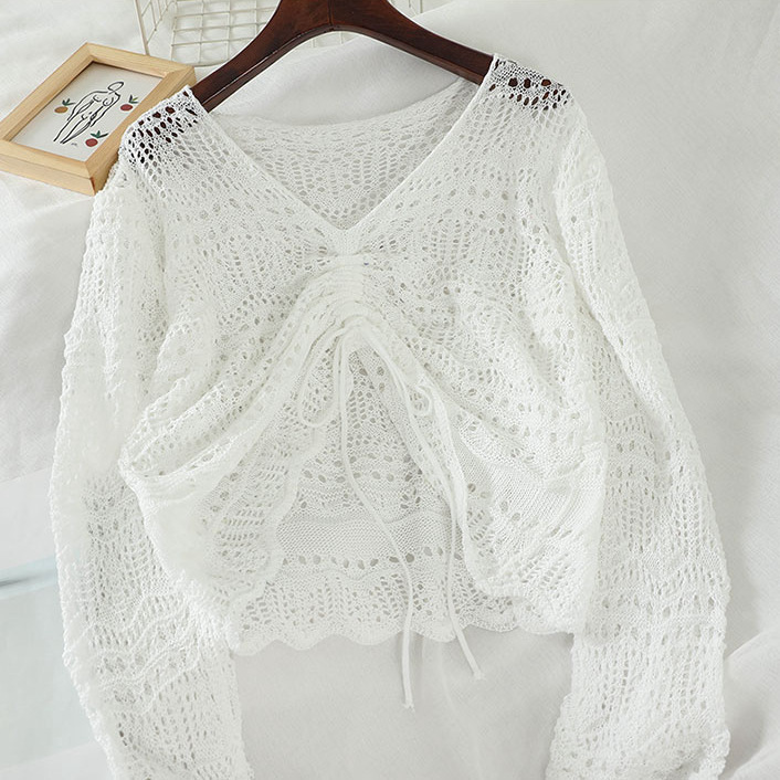 봄과 여름 유럽과 미국의 섹시한 뜨거운 여자 긴팔 니트 중공 블라우스 v 넥 드로스트링 자외선 차단 짧은 풀오버 얇은 스웨터