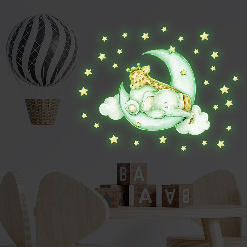 BR-YG-006 빛나는 달 별 아기 코끼리 기린 벽 스티커 어린이 방 스티커 아마존 새로운 폭발스토어 가기