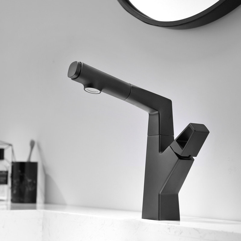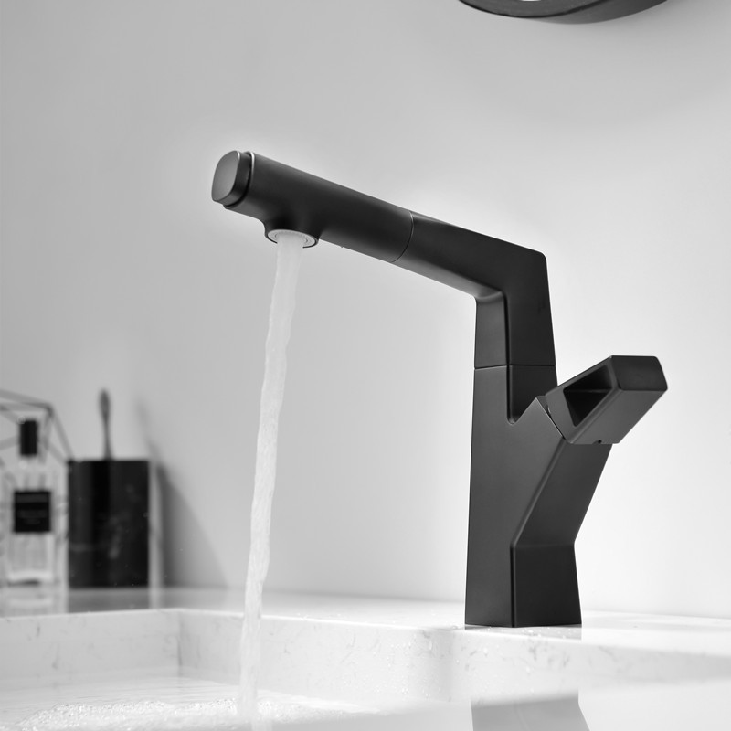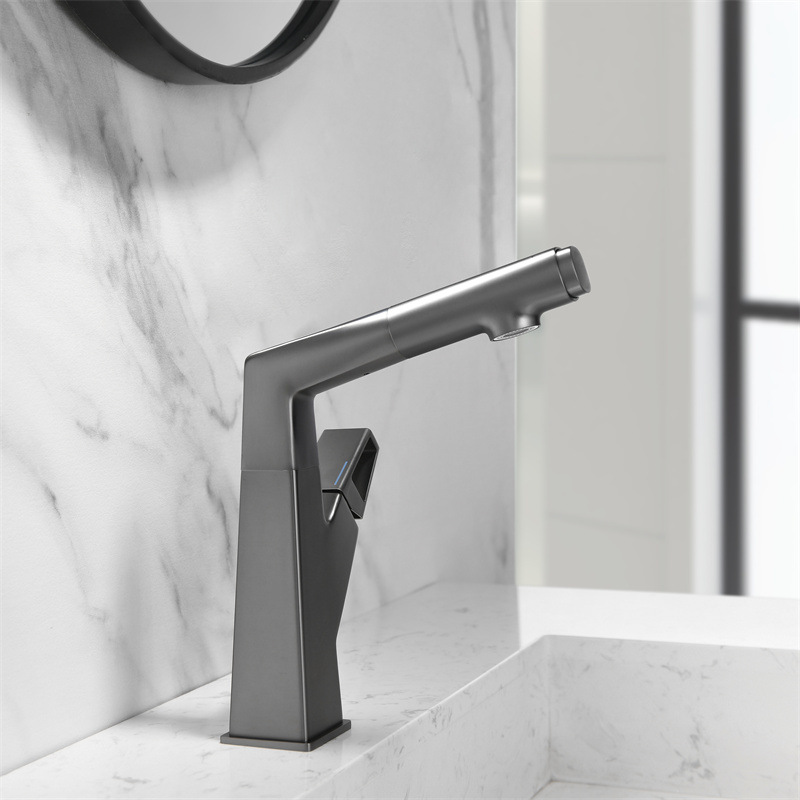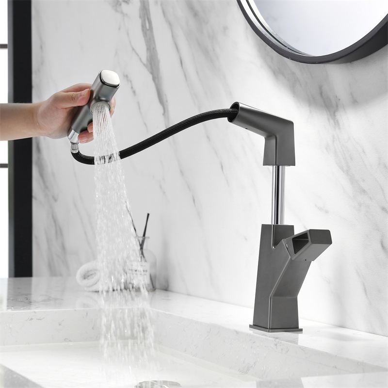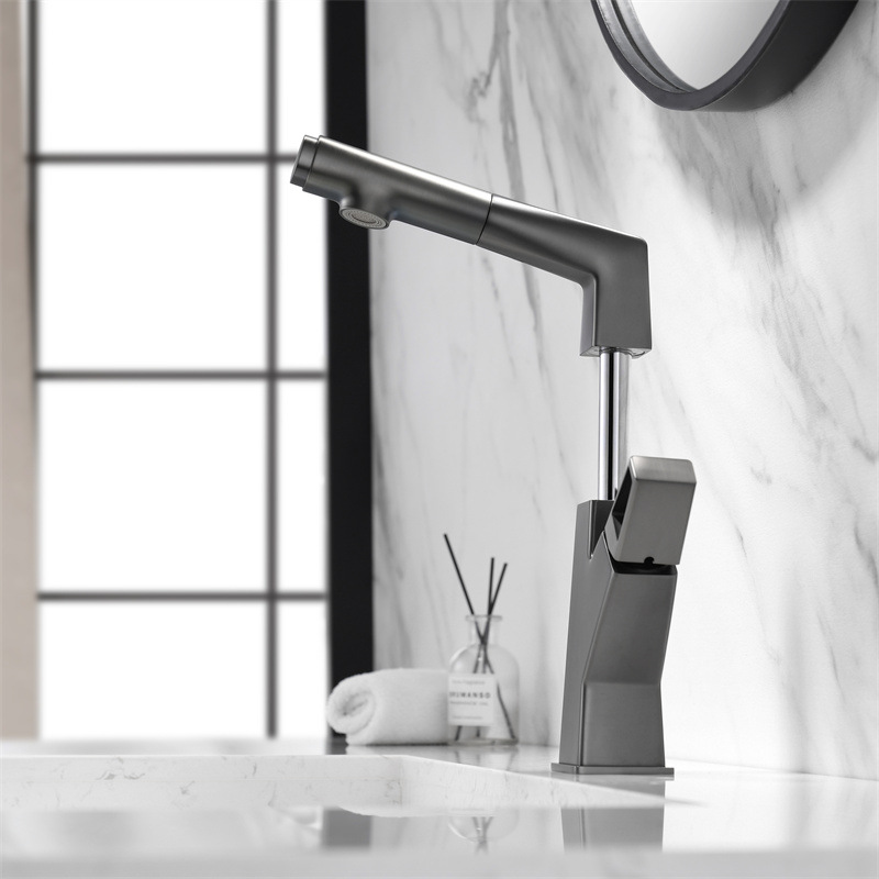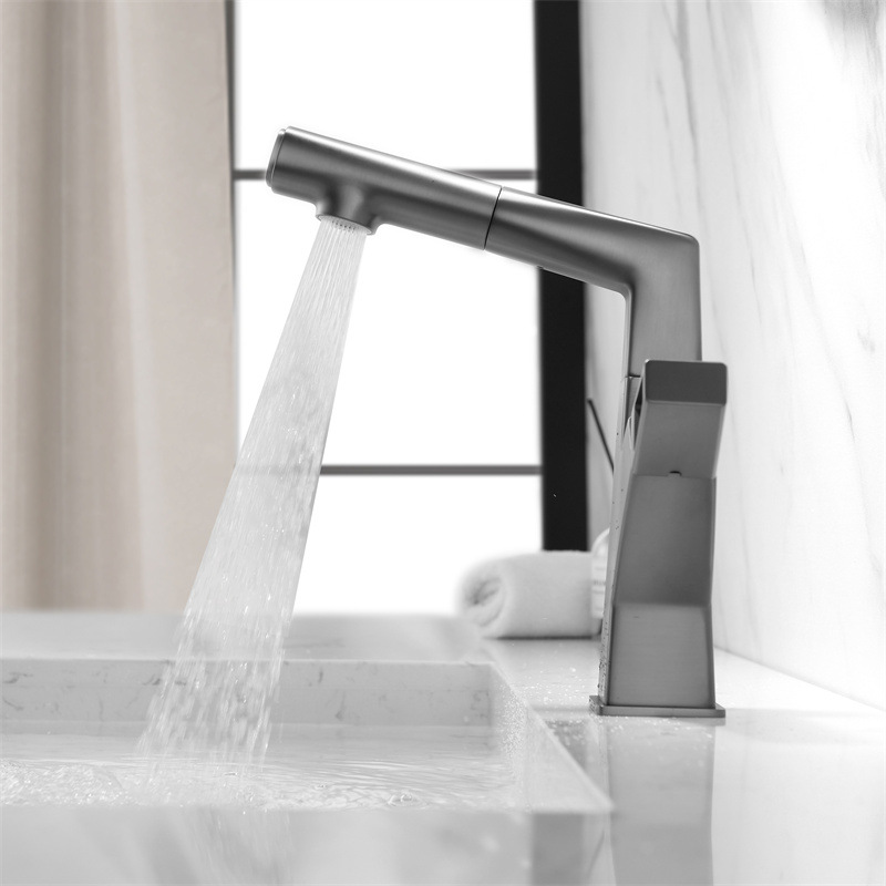 무쿠 건 회색 분지 수도꼭지 리프팅 회전식 텔레스코픽 욕실 분지 수도꼭지 냉수 및 온수 추출