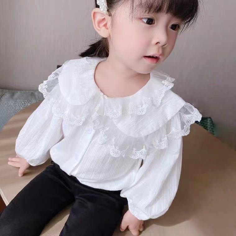 2025 여자 셔츠 유행 레이스 대형 옷깃 셔츠 봄 새로운 스타일 어린이 한국 스타일 달콤한 탑 공주 스타일